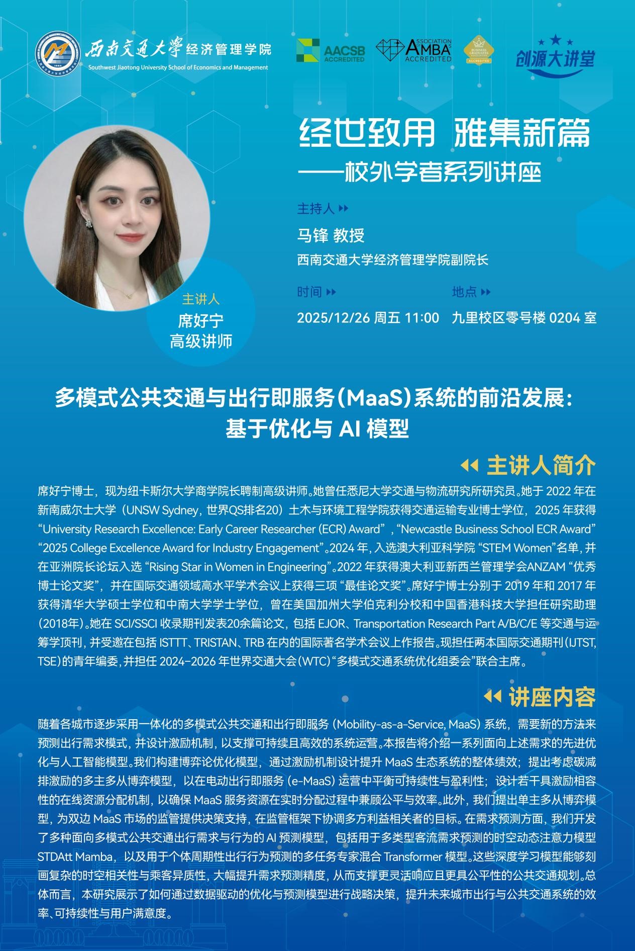 Dr. XI has published over 20 papers in SCI/SSCI-indexed journals, including top journals in transportation and operations research such as European Journal of Operational Research (EJOR) and Transportation Research Part A,B,C,E, and has been invited to present at prestigious international academic conferences including ISTTT, TRISTAN, and TRB. She currently serves as a Young Editorial Board Member for the Urban Transport of China (IJTST TSE), and Co-Chair of the Multimodal Transport System Committee for the World Transport Convention (WTC) from 2024 to 2026.