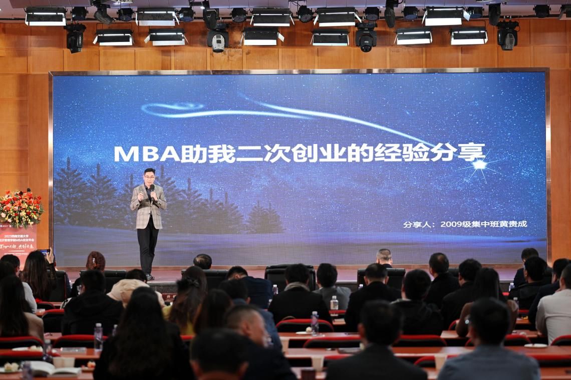 随后,MBA校友黄贵成对个人创业经验和创业历程进行了分享。他讲述了第一次创业失败后的个人思考、行动、结果与感悟,讲述了他如何发挥十余年的市场营销经验与在西南交大MBA学到的系统知识,最终第二次创业成功。