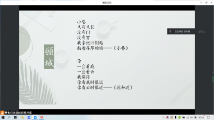 接下来,任永昌讲述了现代诗的特点,并重点介绍了顾城的几篇作品。他指出顾城的作品能够让读者联想到很多现实场景,并给予其灵感。同时展示了海子、木心、余秀华的优秀作品片段以及诗歌《可是你没有》供同学们欣赏。