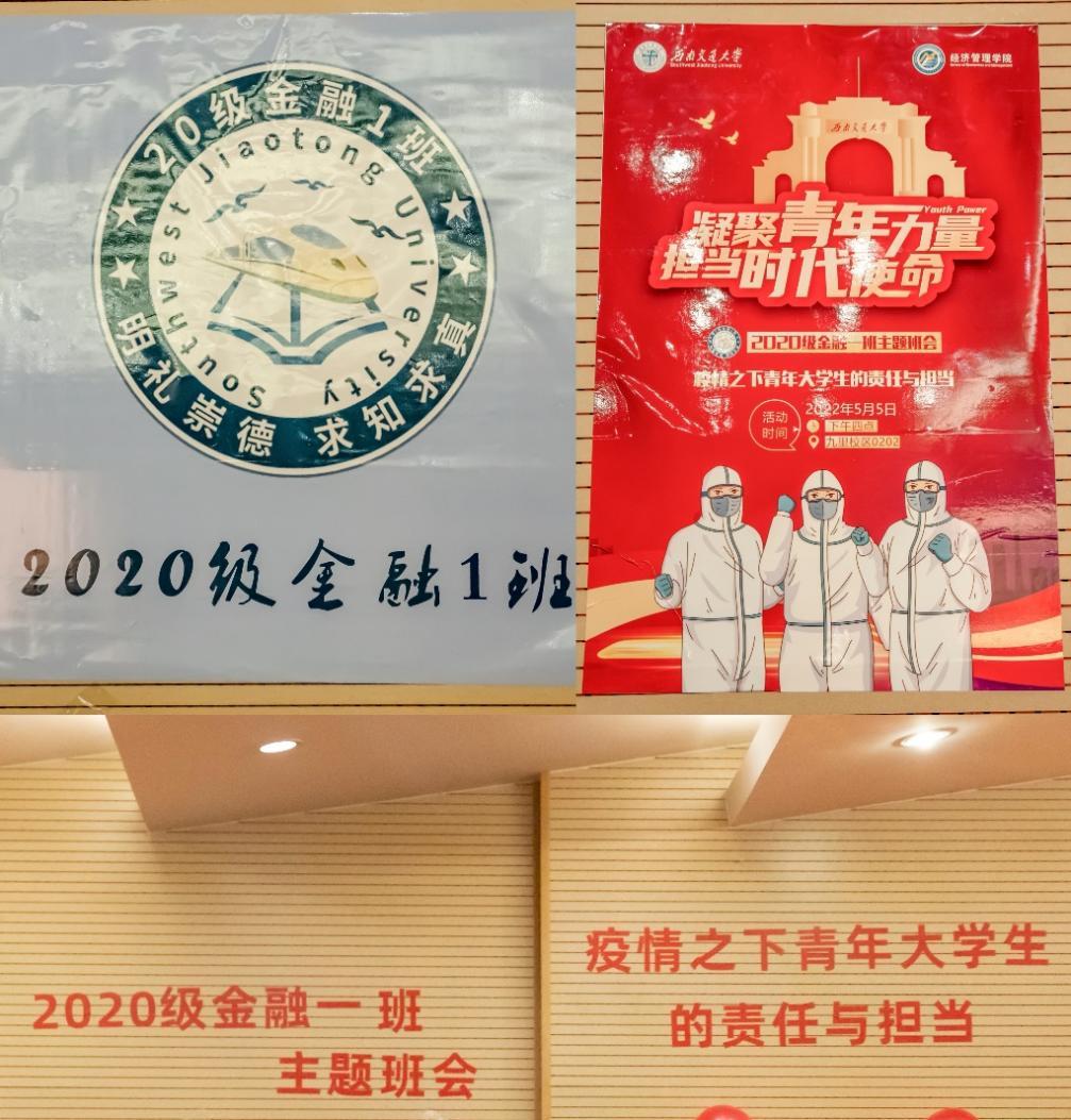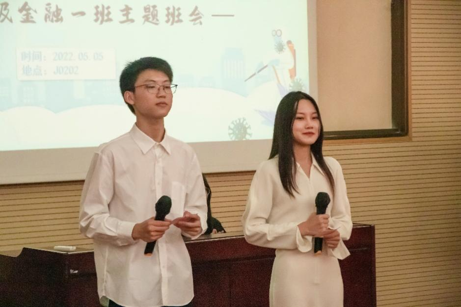 为深入贯彻党的教育方针,在班级内营造良好的班风学风,促进班级同学的全面成长,以实际行动践行新时代青年大学生的责任与担当,2022年5月5日下午4时在九里校区J0202教室,经济管理学院本科2020级金融一班全班38名同学集体开展了“凝聚青年力量,担当时代使命——疫情之下青年大学生的责任与担当”主题班会。经济管理学院党委副书记杨宏毅,经济管理学院团委副书记、本科2020级辅导员陈建奇,本科2020级辅导员罗琴参加了此次班会。