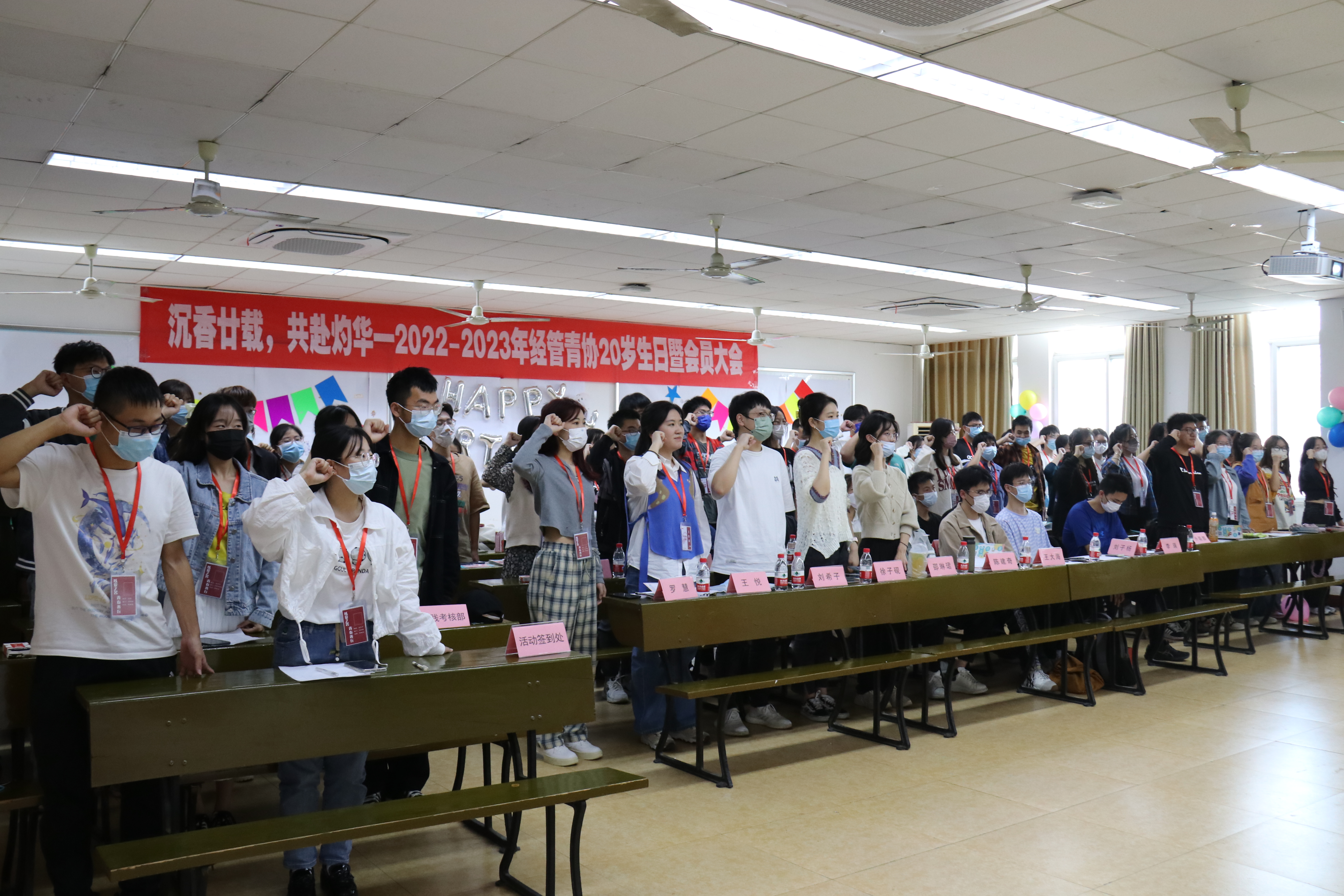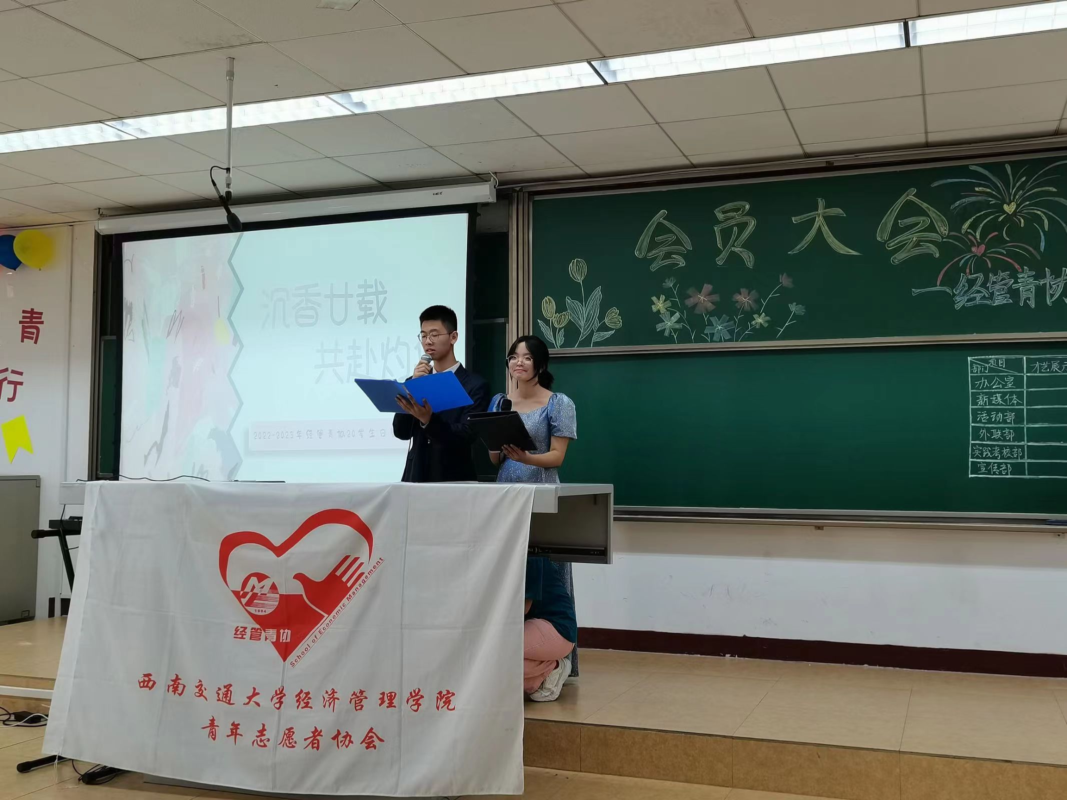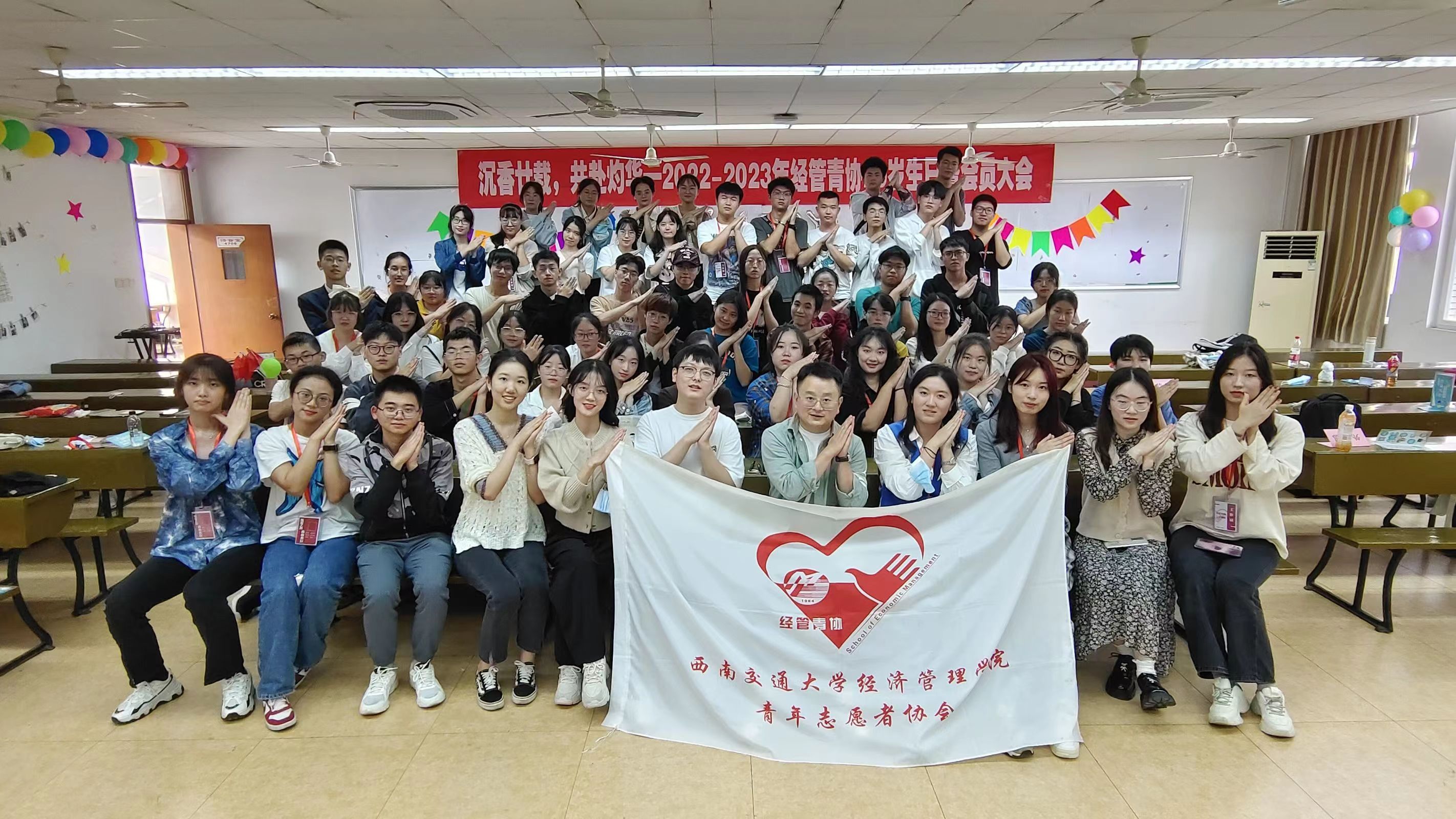 在经济管理学院青年志愿者协会全体成员的共同努力下,经管青协二十岁生日暨会员大会于10月22日下午2点20至4点20在九里校区逸夫馆4709顺利举行。