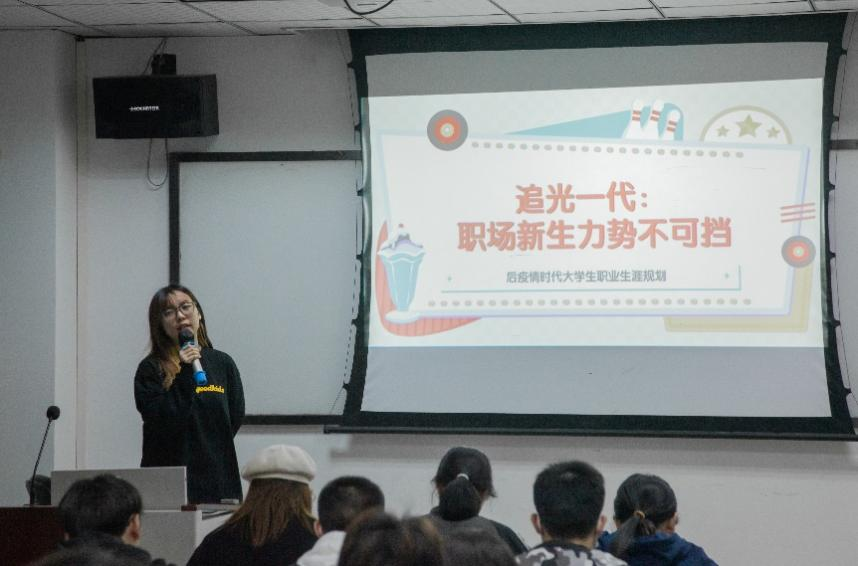 随后,尹玉萌从挑战与机遇、我的理想职场、MBTI性格探索三个板块进行讲解,让同学们更深刻地了解了当下的就业形势与职场现实,并通过MBTI微信小程序,帮助大家分析性格测试结果,以此引导同学们结合自身性格特点合理规划职业方向。