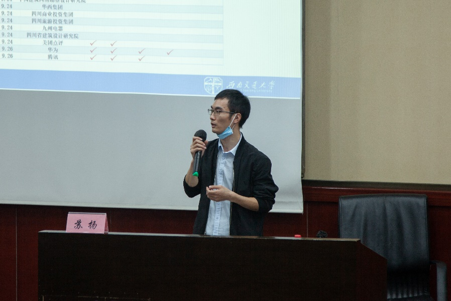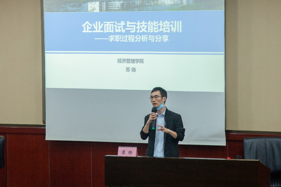 随后苏扬老师就凌川奇同学的分享进行补充,并由实习工作引申到校内团干部工作,讲授了团干部的一些工作细节。之后,苏扬老师结合自身经历,由面到点分析了求职之路的各个要点。