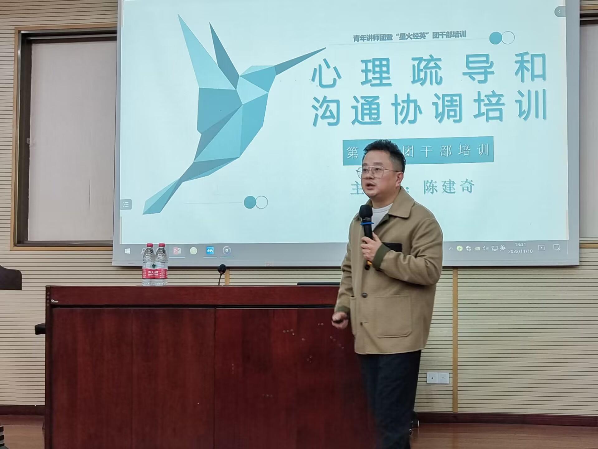 2022年11月10日晚,经济管理学院于J0202教室开展了“星火经英”计划第十期第八次团干部培训,本次培训由分团委副书记、经济管理学院本科2020级辅导员、青年志愿者协会指导老师陈建奇主讲,培训主题为“心理疏导和沟通协调培训”,旨在让团干部们了解心理疏导,明白进行大学生心理疏导以及沟通的重要性以及如何开展。
