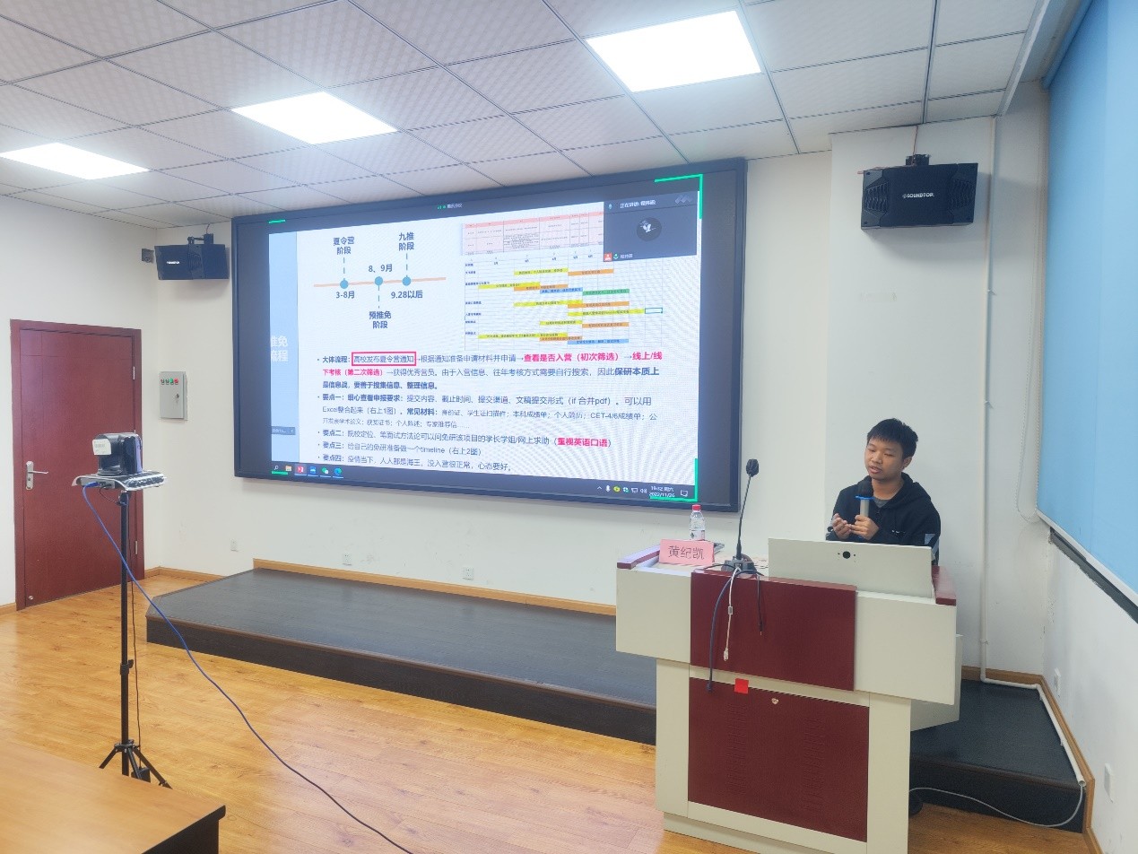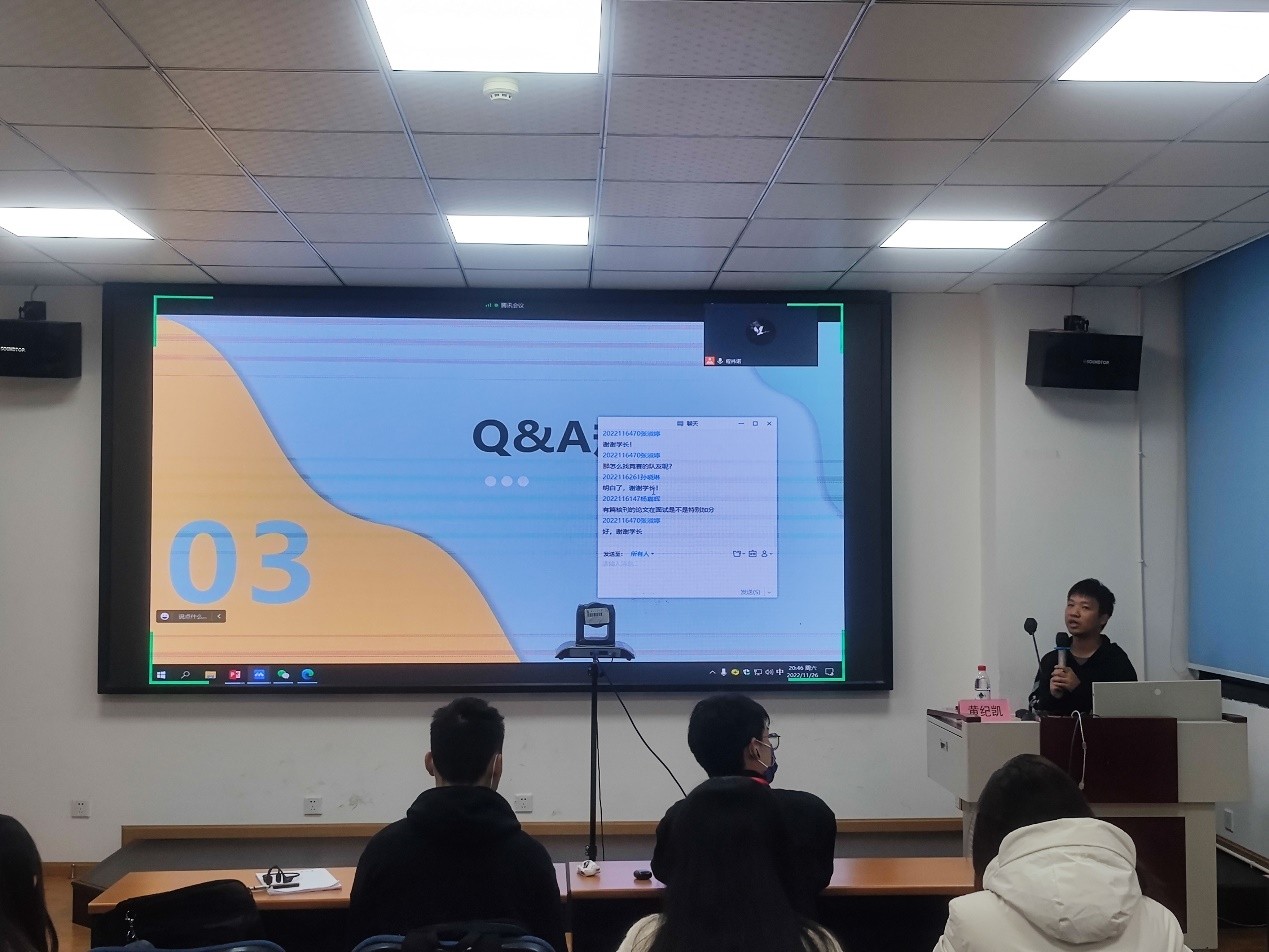 黄纪凯分别从保研、就业两个方面为本科2021、2022级学生分享了相关的经验与方法。他首先以自身保研至复旦大学的成功经历为例,细致地为本科2020、2021级学生讲解了保研所需的各项条件,分别从院校背景、学习成绩、竞赛与科研、实习情况四个维度为同学们展示了保研所需的能力与成绩。黄纪凯指出,良好的学习成绩是保研成功的基础,大学生还是应该以学习为中心,并特别指出了英语在本科生学习和保研考察中所占的重要地位,鼓励同学们认真学好英语,争取高分通过四六级考试。接下来黄纪凯以自己的简历为引,介绍了大学生实习的相关内容。他从实习职业获取渠道、实习职业选择方法、实习期间重点学习内容等方面进行了系统且详尽的指导。黄纪凯用丰富的经验、专业的建议、详尽的评释和细致的指导对大学生涯规划进行了深度剖析。
