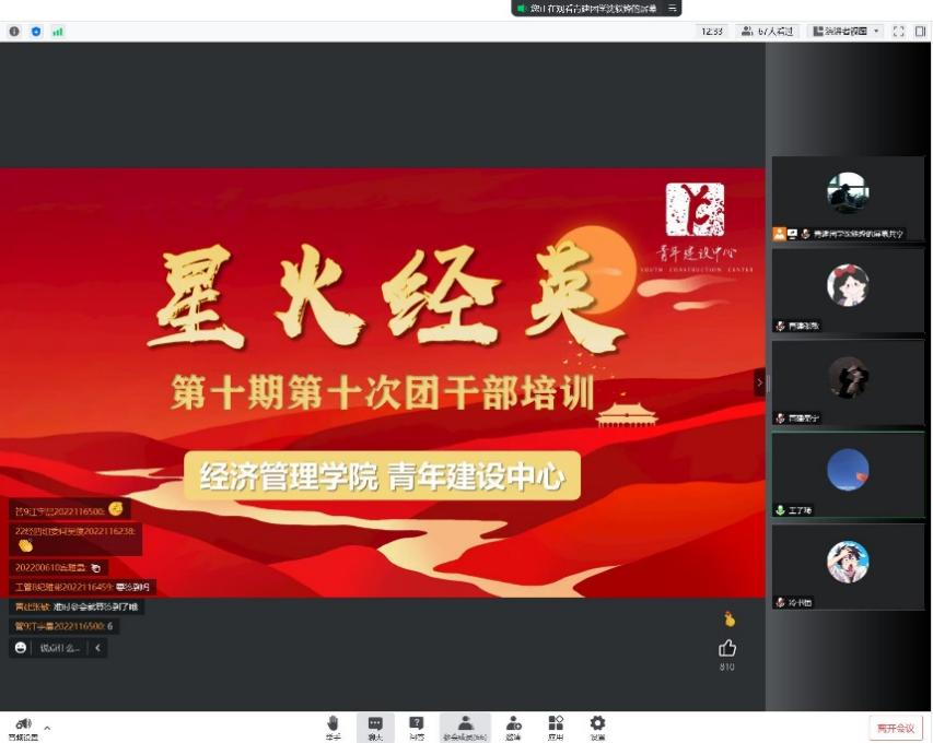 2022年11月24日下午,经济管理学院于线上开展了“星火经英”计划第十期第十次团干部培训,本次会议由2022级辅导员王子琦组织, 2021级博士研究生冷书恒主讲,培训主题为“增强实现中华民族伟大复兴的精神力量”,旨在激励同学们弘扬伟大建党精神,争做新时代先锋力量。