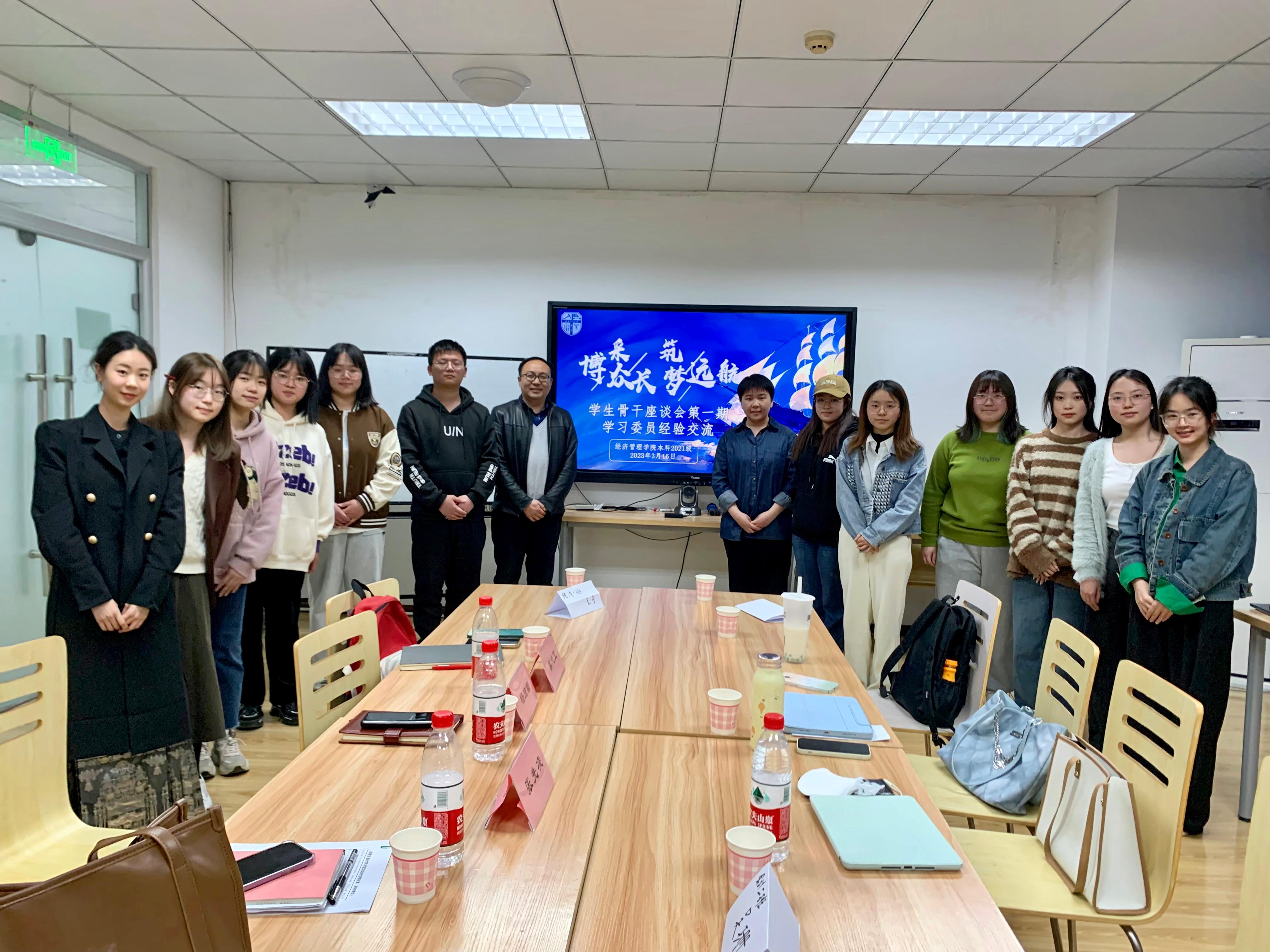 2023年3月16日19时20分,经济管理学院本科2021级于J0411教室开展第1期学生骨干座谈会。活动主题为“博采众长,筑梦远航”,经济管理学院党委副书记、学生工作组组长杨宏毅,本科2021级辅导员张先凌、莫代玉出席本次座谈会,经济管理学院本科2021级各班学习委员参加。