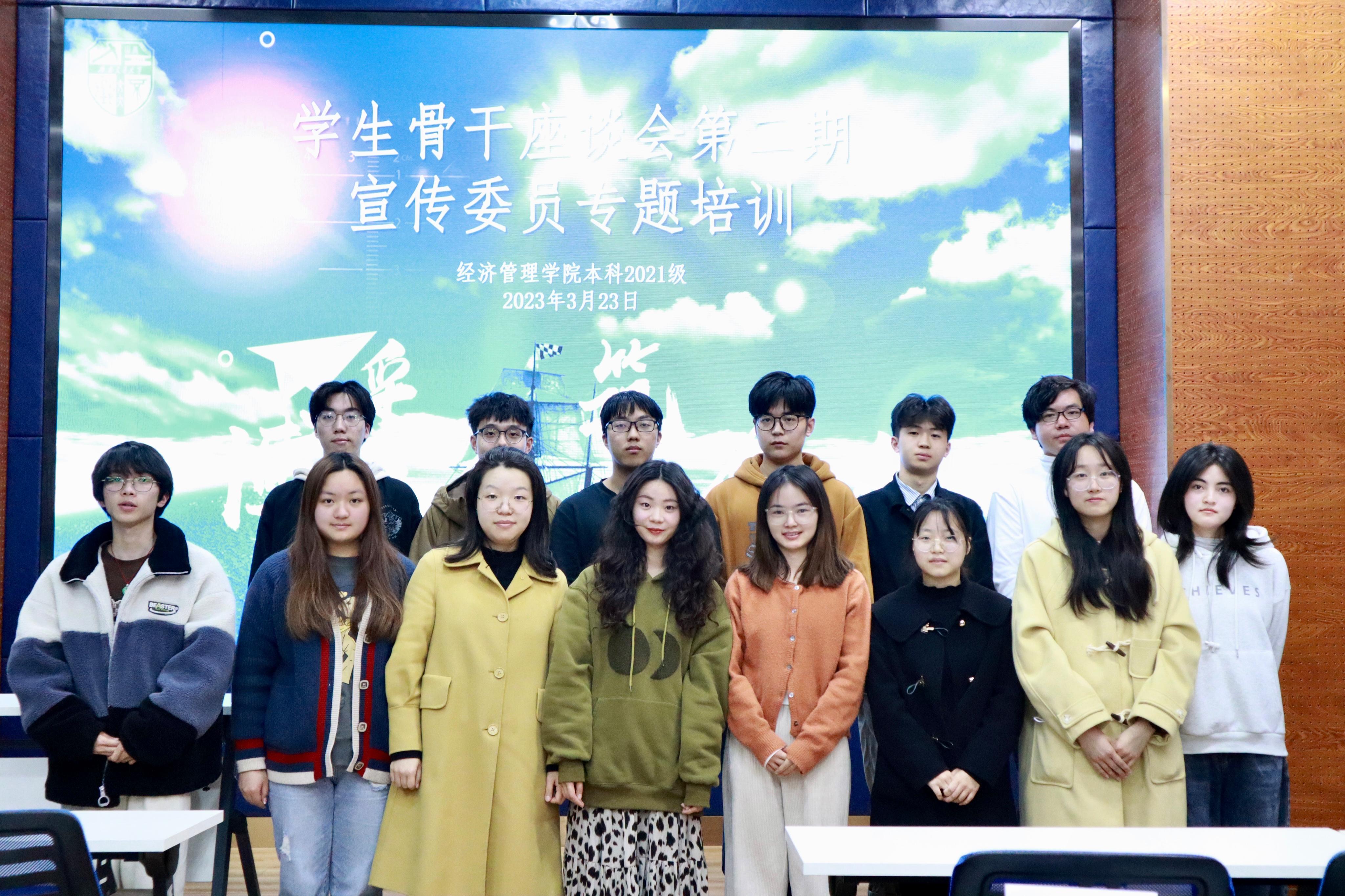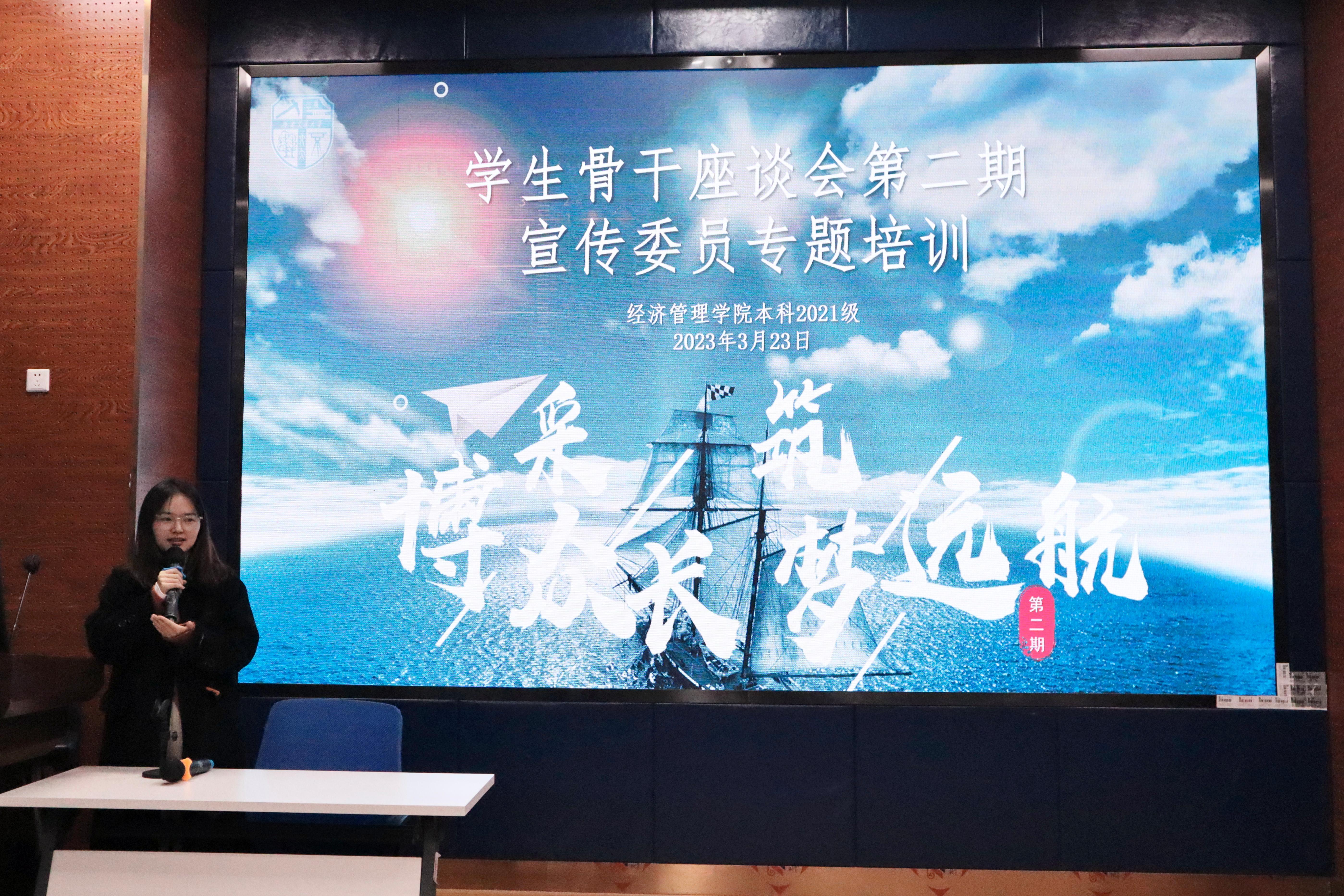 为进一步打造素质高、能力强的宣传队伍,培养学生干部业务能力,2023年3月23日19时30分,经济管理学院本科2021级于J0218教室开展“博采众长,筑梦远航”第2期学生骨干座谈会。本次座谈会邀请经英传媒中心新闻采编部部长李吴傲、摄影部副部长陈焕主讲,本科2021级辅导员张先凌、莫代玉出席,各班宣传委员及部分其他学生干部参加。