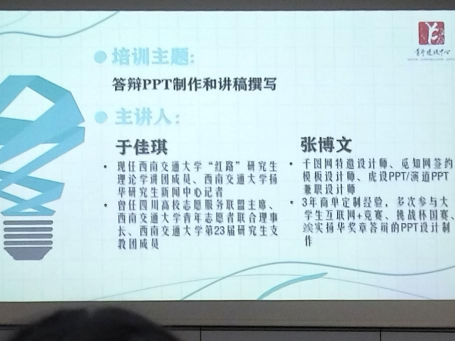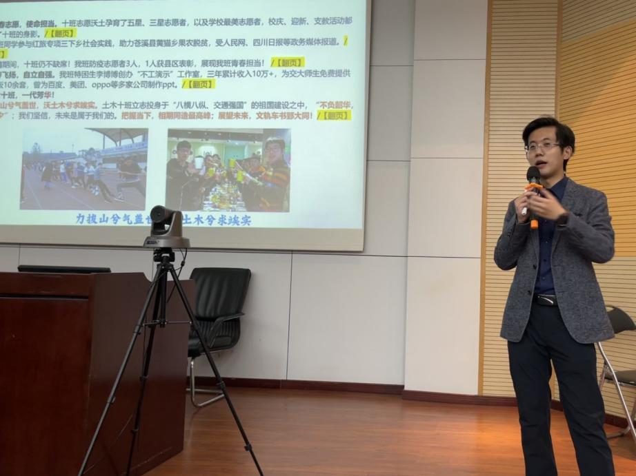 随后由张博文分享ppt制作经验,他从主题细节构建,资源获取渠道,日常训练模板三个方面进行讲解,让同学们知道做什么,如何做,从哪开始做。张博文的讲解激发了同学们对ppt制作的兴趣和思考,给予了同学们深入学习ppt制作的相关指导。