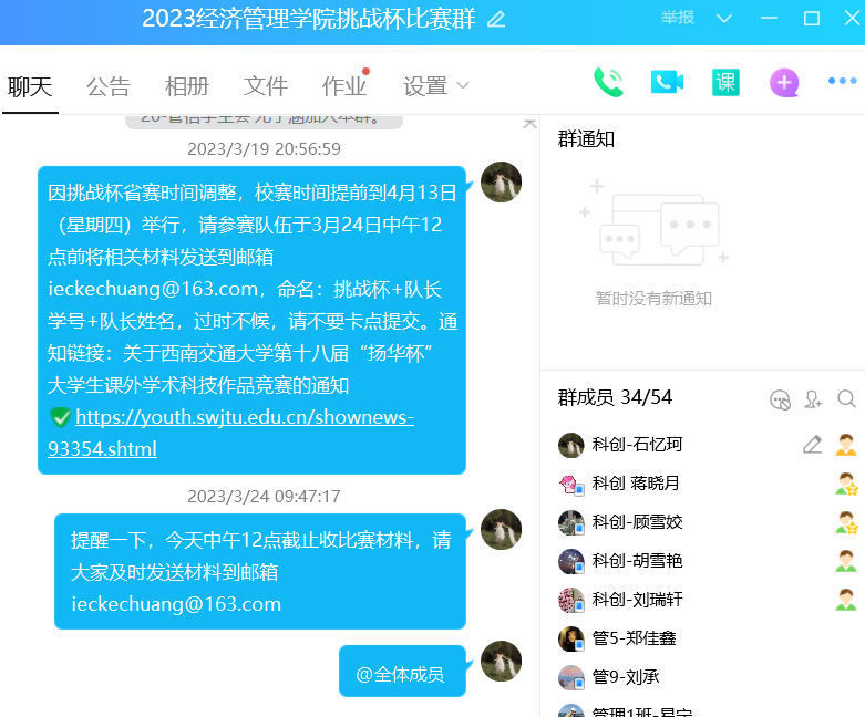 自2023年2月,各学院、各级团组织以多种形式进行广泛的宣传动员。在校团委和学院的通力配合下,经管学院师生充分了解了竞赛内容及总体安排。同时,学院团委通过建立挑战杯比赛QQ群的方式积极组织学院队伍参加比赛。各参赛队在老师指导下完成了申报作品,并完成了作品的提交。我院于四月初顺利收集各报名参赛队伍的材料。后续将结合实际情况统筹开展遴选,推荐优秀项目参加校赛,希望各报名队伍认真准备比赛,同时预祝选手们在比赛中取得理想的成绩!