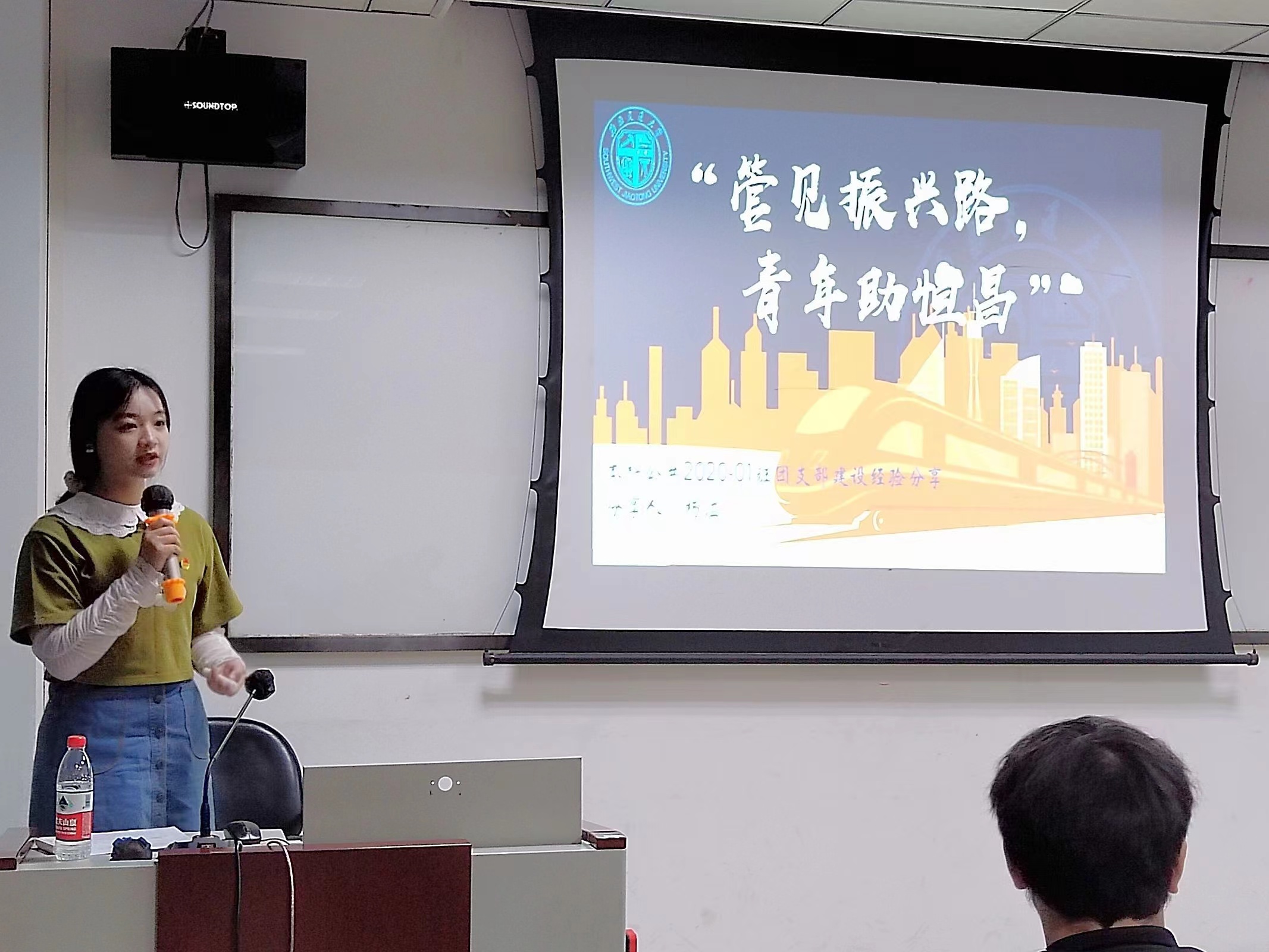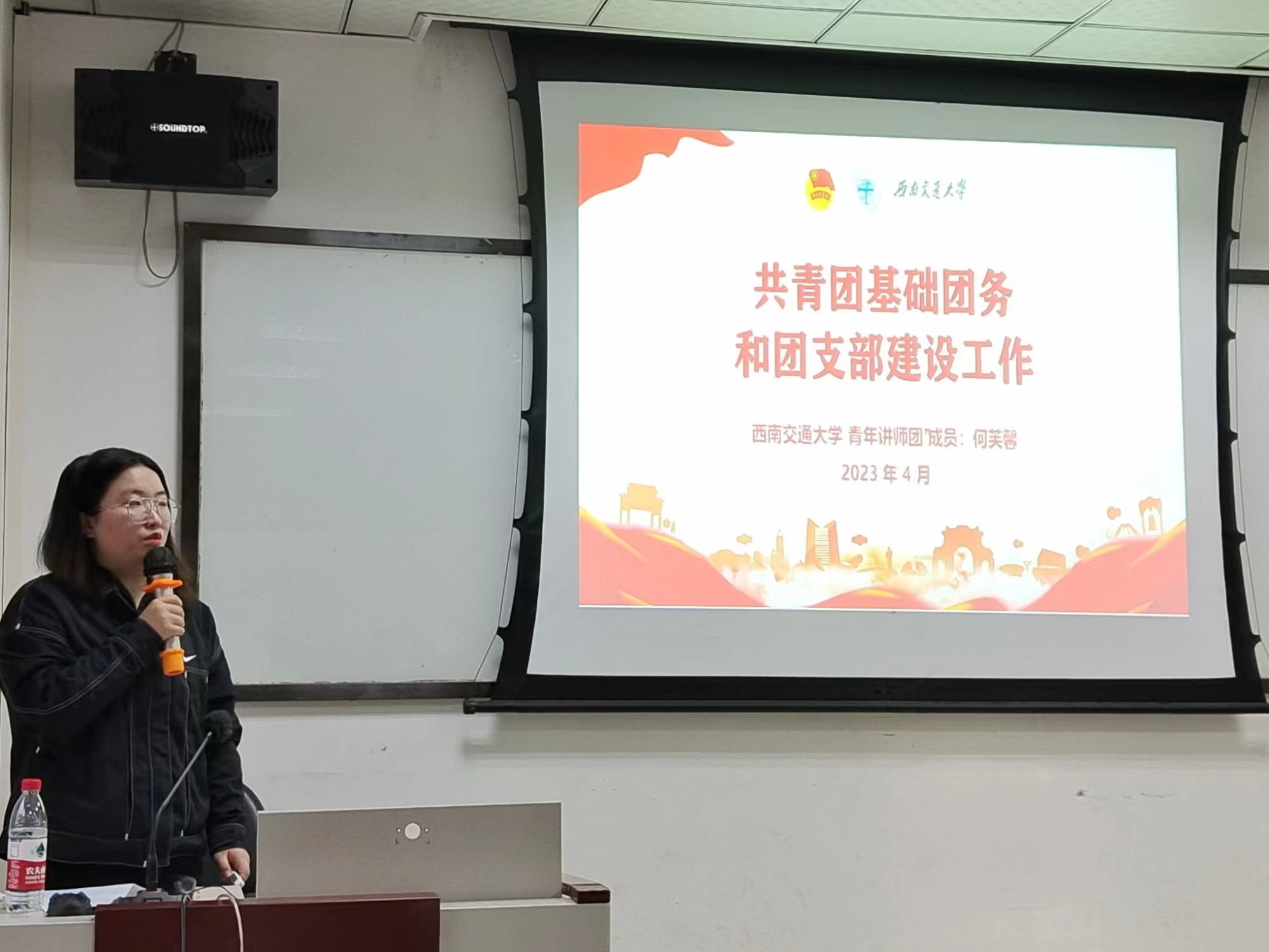 完成对共青团的基本介绍后,何芙馨着重为团干部们介绍了我校的团支部建设工作。首先是关于学校在开展青年团工作时的基本思路:巩固班级团支部的基础地位、实现研究生团支部建设全覆盖、探索青年教工团建新路径。随后具体介绍了我校的特色团支部工作模式,实施“1+5+X”计划,在培养德智体美劳全面发展的社会主义建设者和接班人的基础上,发展团支部的“X”特色。并以西南交通大学工力(拔尖)2019-01班团支部为例:其从思想政治引领、班团活动引领、学风建设引领三个方面展示了特色的班级风采。接着何芙馨讲解了什么是“三会两制一课”,并简要介绍了学校的青马工程,鼓励团干部们坚持理论学习,积极配合“三会两制一课”制度的开展,抓住实践锻炼机会。