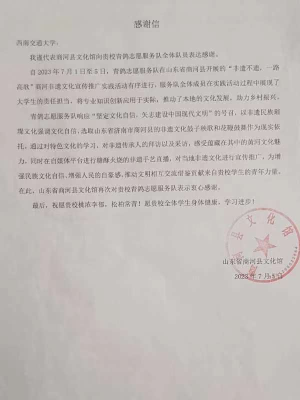 此次实践,队员们深入基层,致力于非遗文化传习和推广,为建设文化强国助力,为乡村振兴注入青年力量。活动得到了当地政府部门、群众的大力支持和一致好评,活动结束后,实践团队收到了来自商河县文化馆的感谢信。