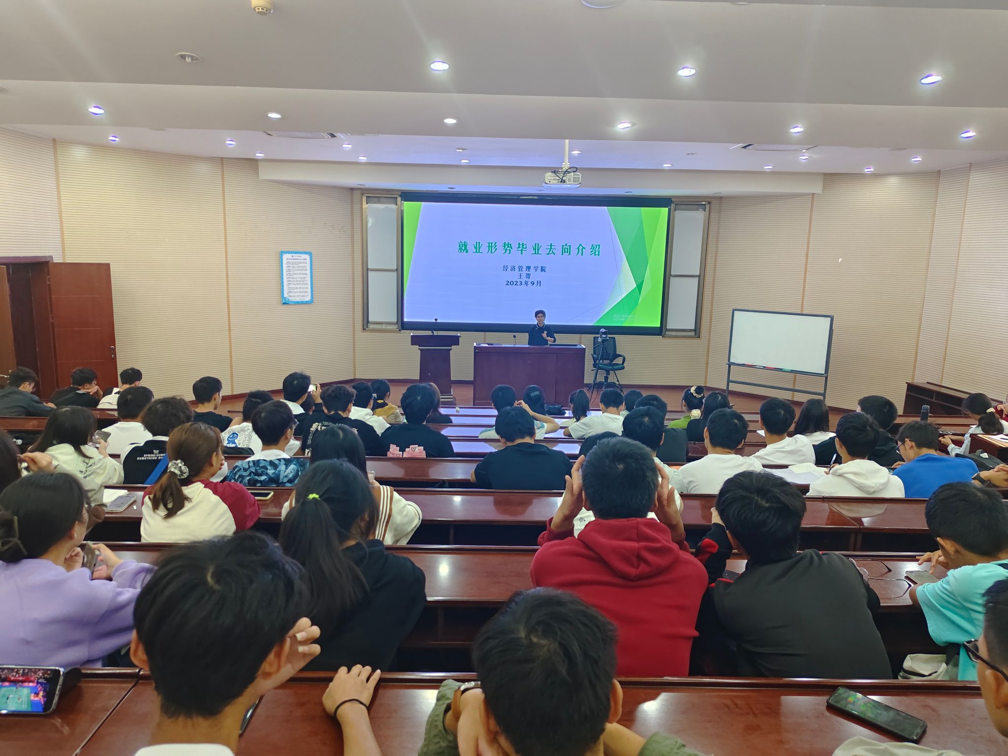 2023年9月27日上午,经济管理学院本科2023级经济贸易类专业在零号楼0202室召开了生涯教育之就业形势与毕业去向介绍会。学生工作组副组长王哿老师主讲,2023级经济贸易类全体同学参加。此次介绍会旨在帮助同学们了解就业形势,尽快适应大学生,及早明确个人方向,做好个人大学规划,努力提升个人能力与素质。