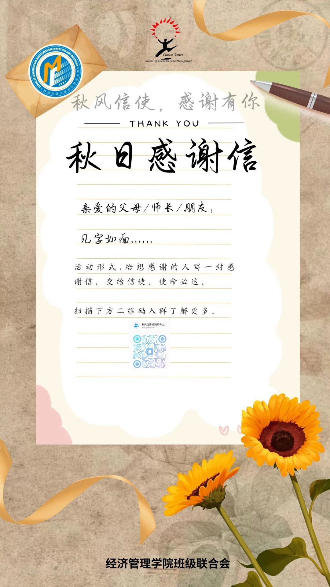 生活中会遇到许多烦恼与困难,这时总有人向我们伸出援手,可能是养育我们的父母、教导我们的老师,也可能是陪伴我们的朋友、朝夕相处的同学,甚至可能是一个陌生人。为帮助同学们传递温暖,常怀感恩,经济管理学院班级联合会10月10日至17日举办“秋风信使,感谢有你”主题心理活动,帮助同学们积极表达、关爱他人,进一步弘扬社会正能量,从而助力同学们的心理健康发展。