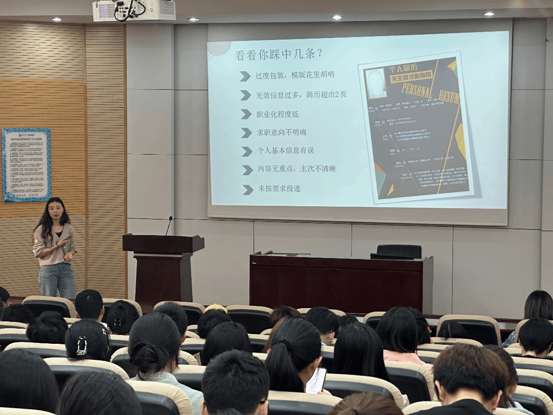 接着张老师为大家逐一讲解了制作简历过程中的基本原则、内容取舍、排版样式等问题;同时用正反面进行对比,使同学们对如何写出一份好简历有了更清晰的认识。张老师最后对同学们提出期许:“想要制作出一份优秀简历,离不开自己大学四年的努力。”