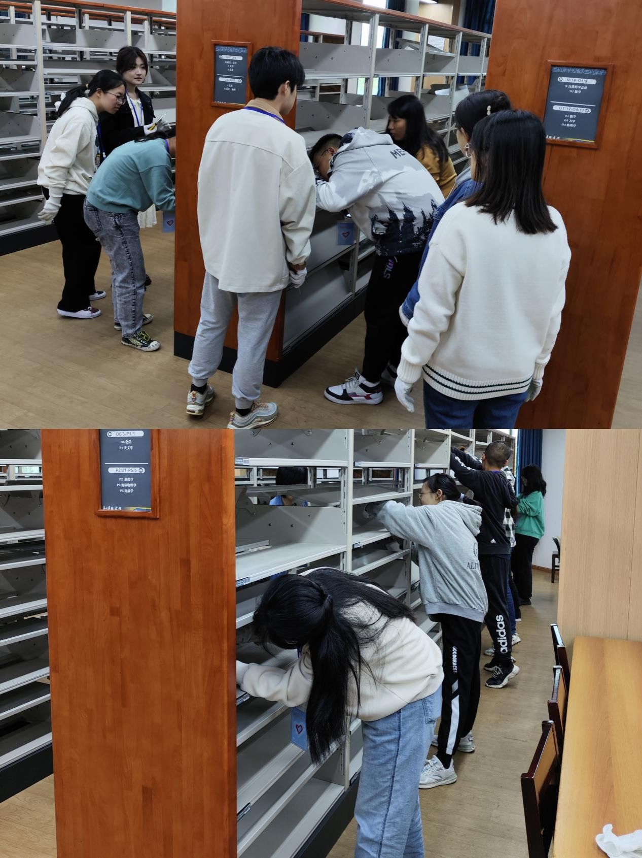 书架的安装、重组和清洁是图书馆日常管理中三个非常重要的环节。在负责老师的指导下,同学们在指定的活动区域有条不紊地进行合作,或是拿起螺丝刀将图书架进行微调;或是仿照其他图书架进行重新组装;或是对图书架进行清洁,保证其卫生。在老师的悉心指导下,同学们互相交流经验并互帮互助,很快就得心应手起来。