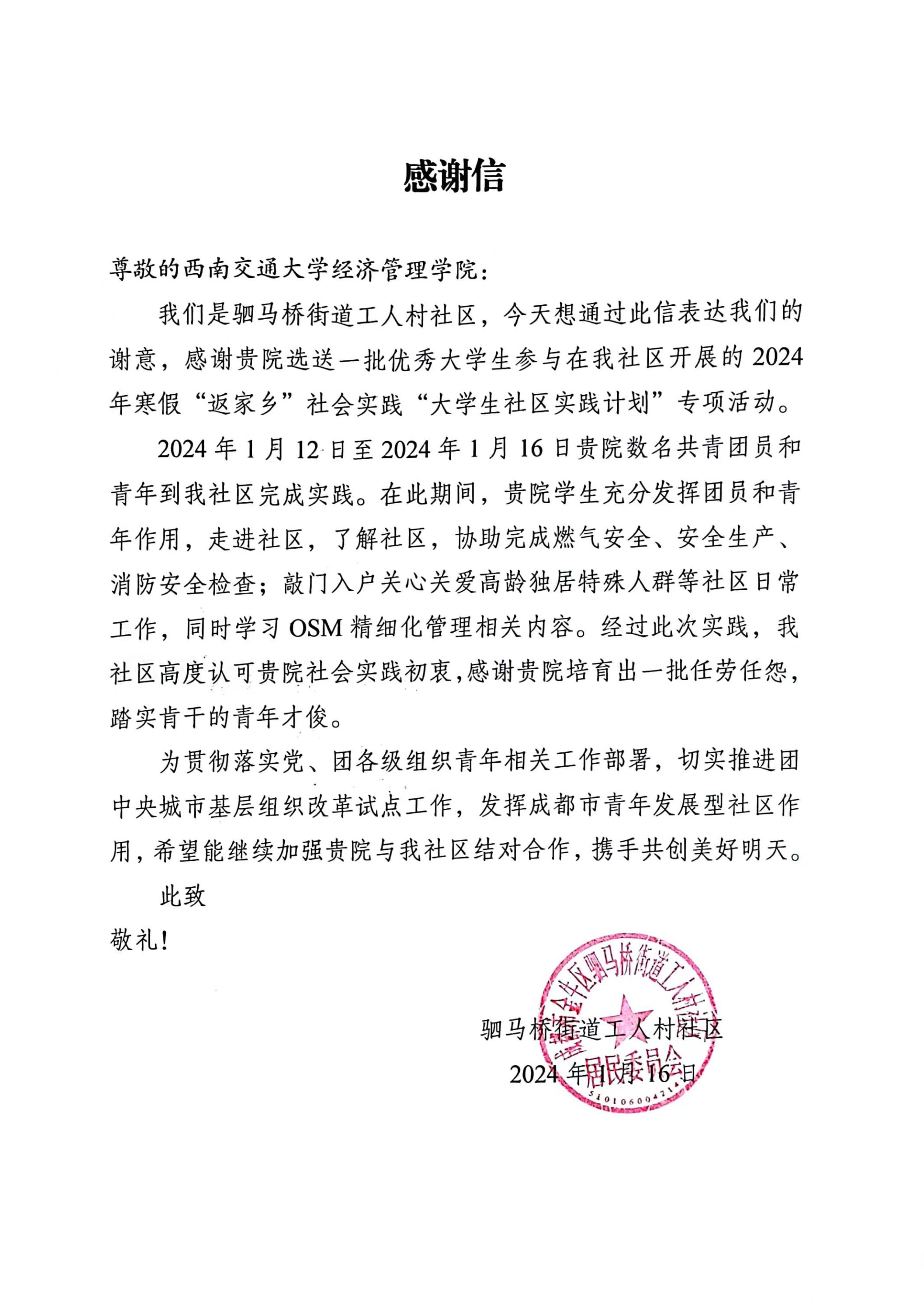 实践队获得了来自驷马桥街道工人村社区感谢信。