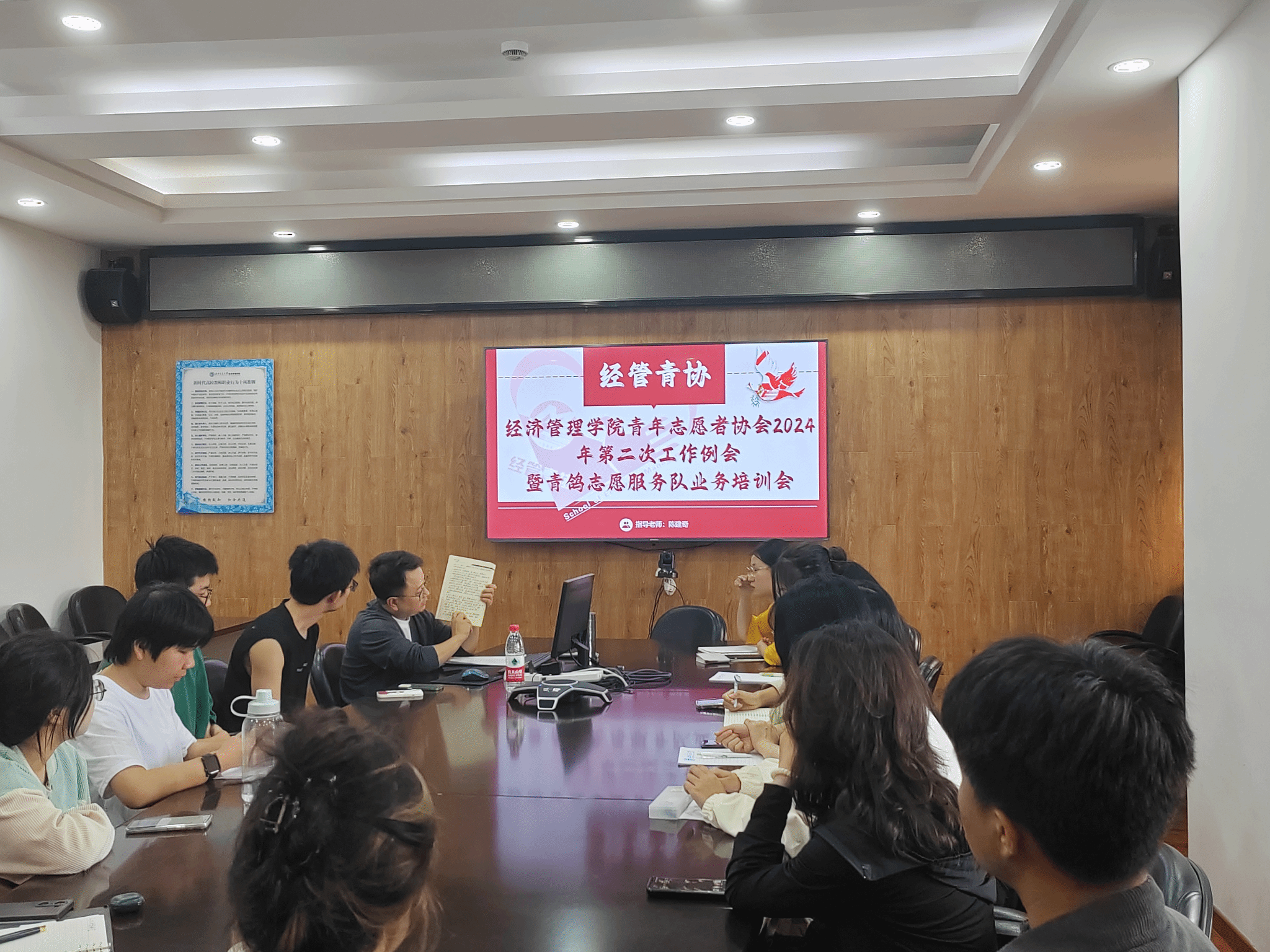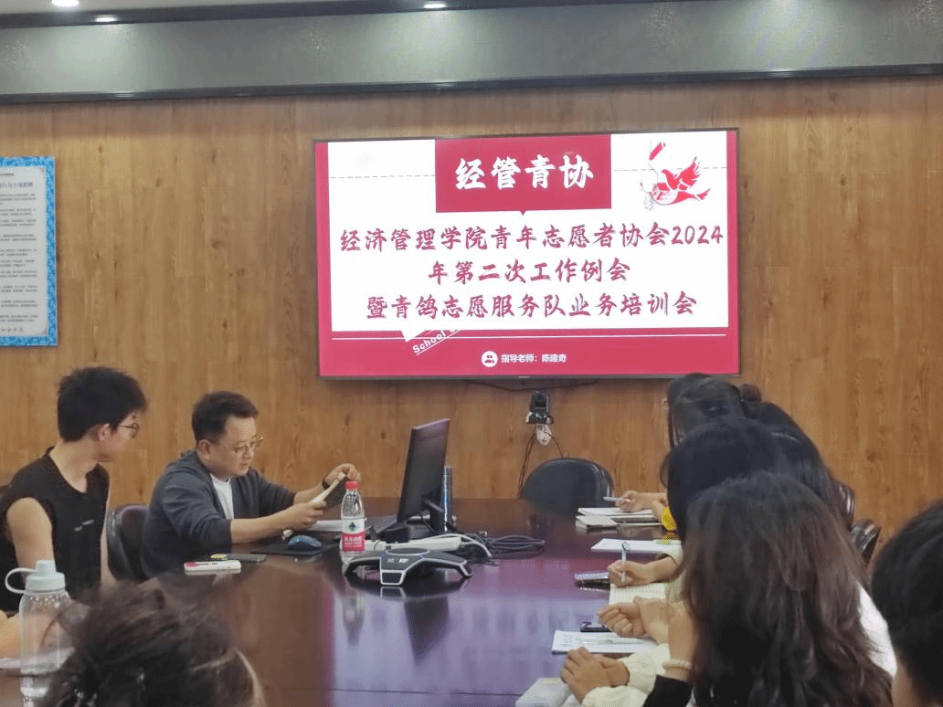 为了更好地服务于学校广大师生,优化志愿活动成效,全方位增进经济管理学院青年志愿者协会成员的综合能力,2024年5月8日中午12:30,经济管理学院青年志愿者协会在J0607教室组织了2024年第二次工作例会暨青鸽志愿服务队业务培训会。