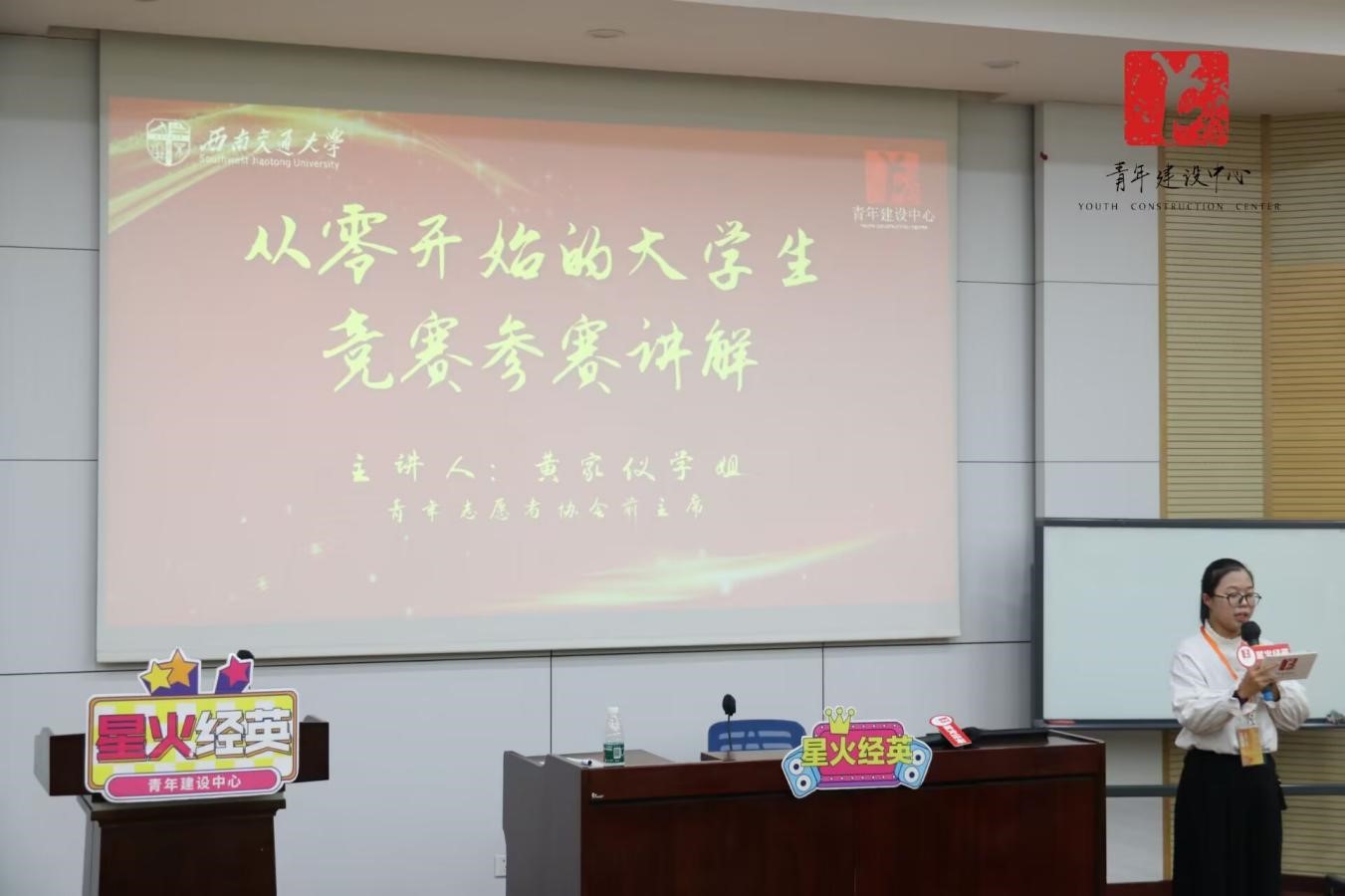 2024年10月23日晚19点半,“星火经英计划”第十四期第四次团干部培训于J0215顺利开展。本次培训会由青年志愿者协会前主席,中共预备党员,大学生科创与实践中心项目孵化部副部长黄家仪主讲,主题为“从零开始的大学生竞赛参赛讲解”,旨在分享大学生创新大赛红旅赛道的比赛经验,帮助同学们了解更多竞赛相关内容。