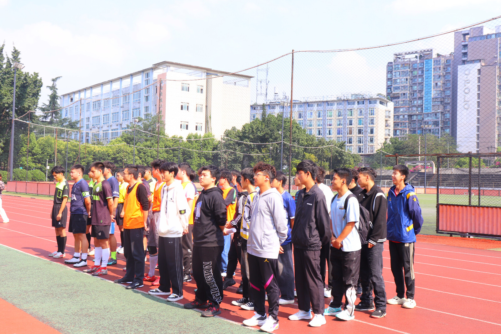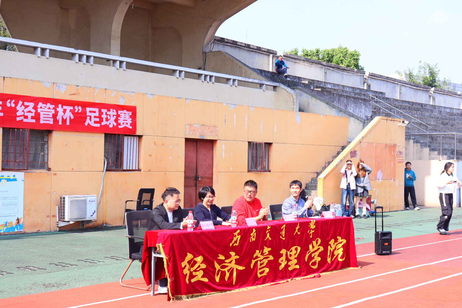 2024年10月28日中午,经济管理学院2024年“经管杯”足球赛开幕式暨揭幕战在九里校区足球场举行。研究生辅导员王哿老师,西南交通大学体育学院足球老师、成都市足球协会裁判讲师马朗老师,经济管理学院团委副书记、青年志愿者协会指导老师、本科2024级辅导员陈建奇老师,经济管理学院团委副书记、学生会指导老师、本科2023级辅导员苏扬老师出席本次开幕式。