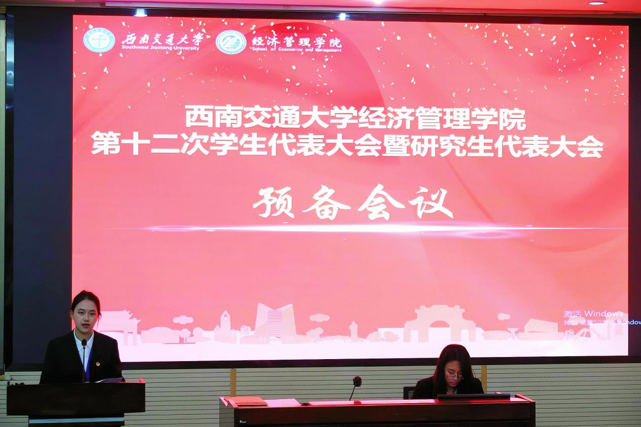随后全体代表于主会场展开了预备会议,在会议中审议通过《西南交通大学经济管理学院第十二次学生代表大会暨研究生代表大会筹备工作报告》《西南交通大学经济管理学院第十二次学生代表大会暨研究生代表大会代表资格审查报告》等,并审议通过了西南交通大学经济管理学院第十二次学生代表大会暨研究生代表大会主席团成员、秘书长、副秘书长建议名单和新一届学生会主席团候选人、研究生会主席团候选人名单,以及监票人、计票人名单,最后宣布了会议纪律要求及会议须知。