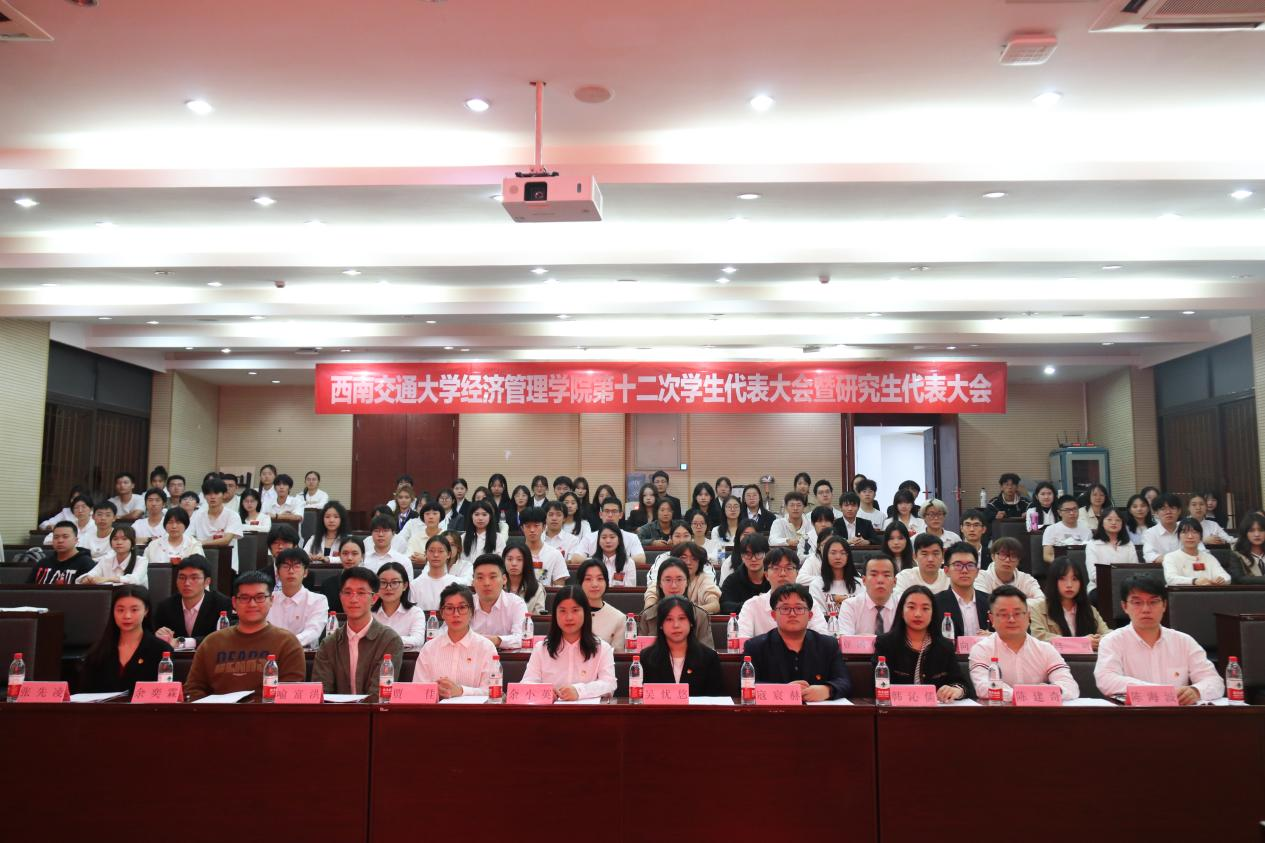 2024年10月24日晚,西南交通大学经济管理学院第十二次学生代表大会暨研究生代表大会在西南交通大学九里校区零号教学楼0202教室召开。参加本次大会的人员有经济管理学院党委副书记余小英,西南交通大学学生会主席吴忧悠,经济管理学院团委书记贾佳,利兹学院团委副书记寇宸赫,经济管理学院团委副书记陈建奇,各兄弟学院学生会、研究生会指导老师及兄弟院会的主席团成员代表,经济管理学院全体辅导员及学院全体学生代表。此次大会由经济管理学院团委副书记苏扬主持。