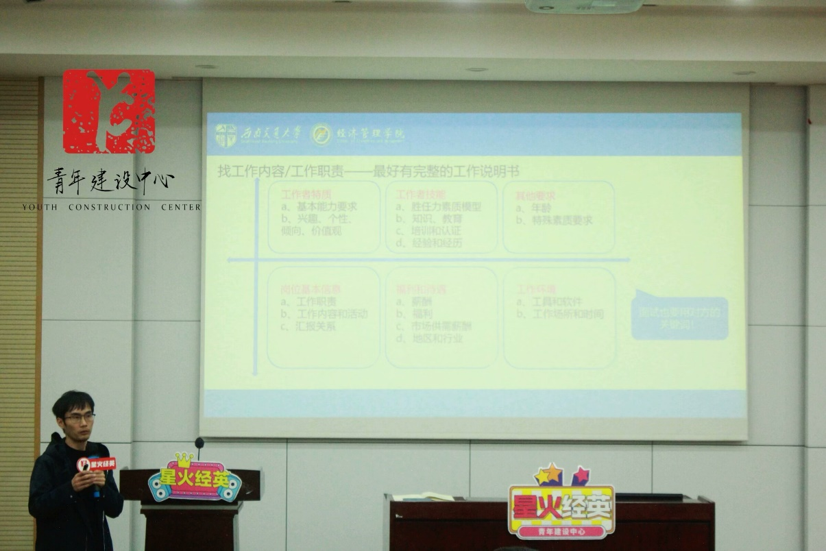 2024年11月21日晚,“星火经英”计划第十四期第六次团干部培训于J0215顺利开展,本次培训由西南交通大学青年讲师团成员、经济管理学院本科2023级辅导员苏扬老师主讲,主题为“企业面试与技能培训”,旨在帮助团干部们掌握面试技巧,提升就业能力。