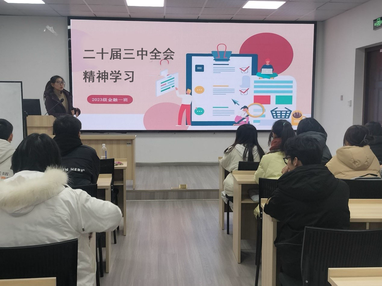 2024 年 12 月 11 日晚,经济管理学院金融 2023-01 班成功开展了一次主题为“学习党的二十届三中全会精神”的团课活动。学院团委书记贾佳老师带领同学们学习了党的二十届三中全会精神,同学们围绕推动金融高水平对外开放、成渝双城经济圈金融中心建设等方面进行了深入学习和讨论。