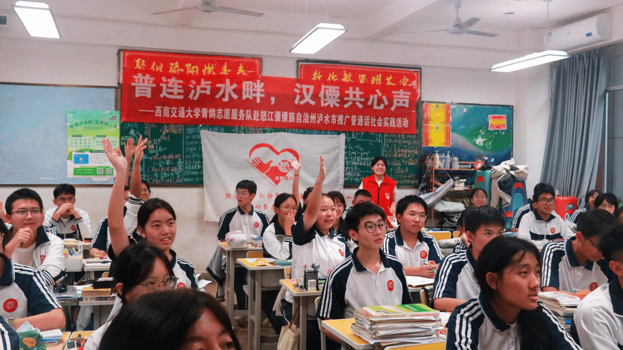 最后,伴随着一颗颗懵懂却又炙热的心,伴随着一个个稚嫩又伟大的梦想,伴随着一句句欢声与笑语,推普课堂在大家”普连泸水畔,汉僳共心声”的口号声中落幕。