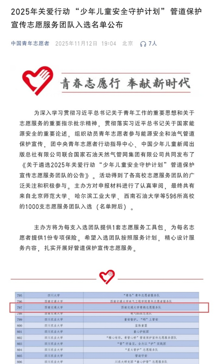 青春践行使命,志愿点亮初心。未来,“青鸽志愿服务队”将以此次入选为契机,深耕管道保护宣讲领域,不断提升服务专业化水平,用实际行动诠释“奉献、友爱、互助、进步”的志愿精神,让能源安全理念深入人心,为少年儿童安全成长保驾护航,在志愿服务的广阔舞台上书写新时代青年的责任与担当。