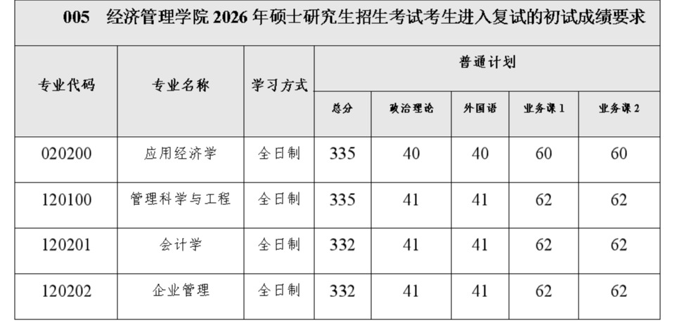 第一志愿报考我院各专业的考生,初试成绩达到下表中对应专业的成绩要求,方才具备复试资格。