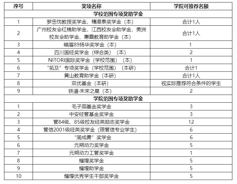 2. 专项奖助学金可推荐名额