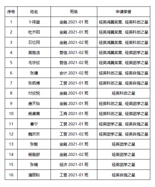 3、答辩顺序:按照经英鸿翼奖章、经英科创之星、经英团学之星、经英自强之星的顺序答辩(详见下表)。