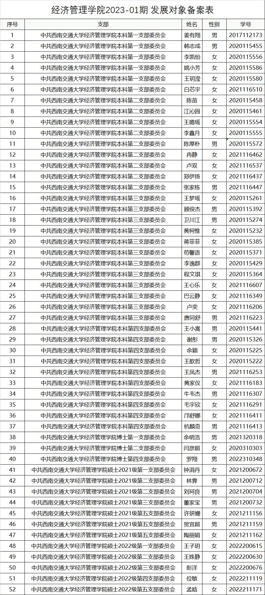 根据《中国共产党支部工作条例(试行)》《中共西南交通大学委员会基层党组织建设工作文件汇编》的有关规定,经过相关党支部全面了解、考察,并经院党委审核,拟将以下52位同志确定为经济管理学院党委2023-01期党员发展对象,现予以公示。