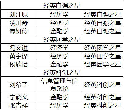 根据《西南交通大学经济管理学院本科毕业生专项表彰评定暂行办法》及学院相关工作安排,经过学生本人申请、学生工作组审核、学院评审小组现场评审,本次评选称号包括经英自强之星、经英科创之星、经英团学之星,根据评选工作相关规定,现将经济管理学院2023届本科毕业生专项表彰获得者进行公示。公示名单如下: