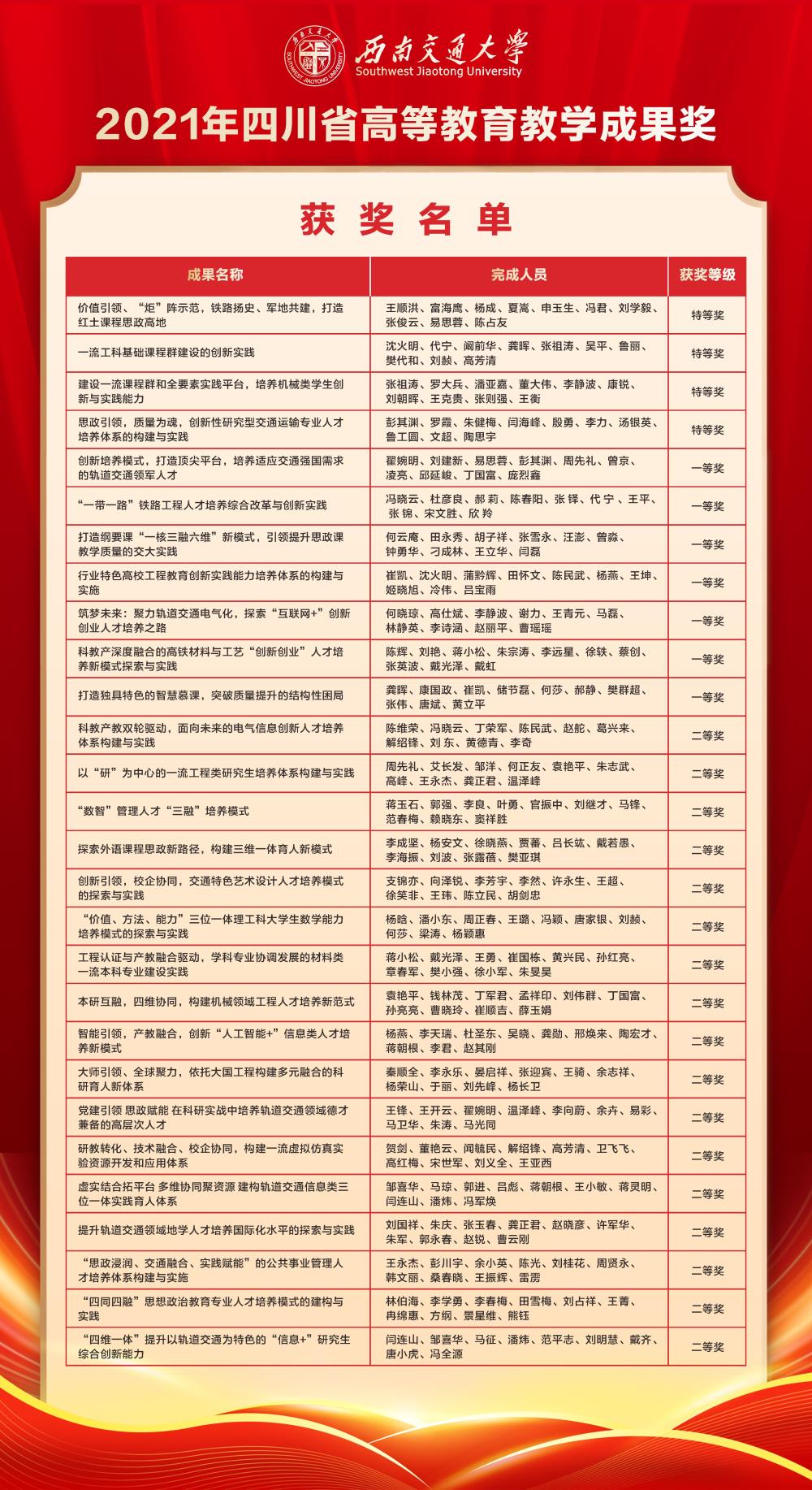 近日,四川省人民政府公布了2021年四川省教学成果奖名单。西南交通大学主持获批四川省高等教育教学成果奖特等奖4项、一等奖7项、二等奖17项,获特等奖数量全省第二。另外参与获批特等奖1项、二等奖3项。在本届四川省高等教育教学成果奖获奖率减少30%的前提下,学校主持获奖总数较上届增加2项,获奖数量占全省比例提高17%。