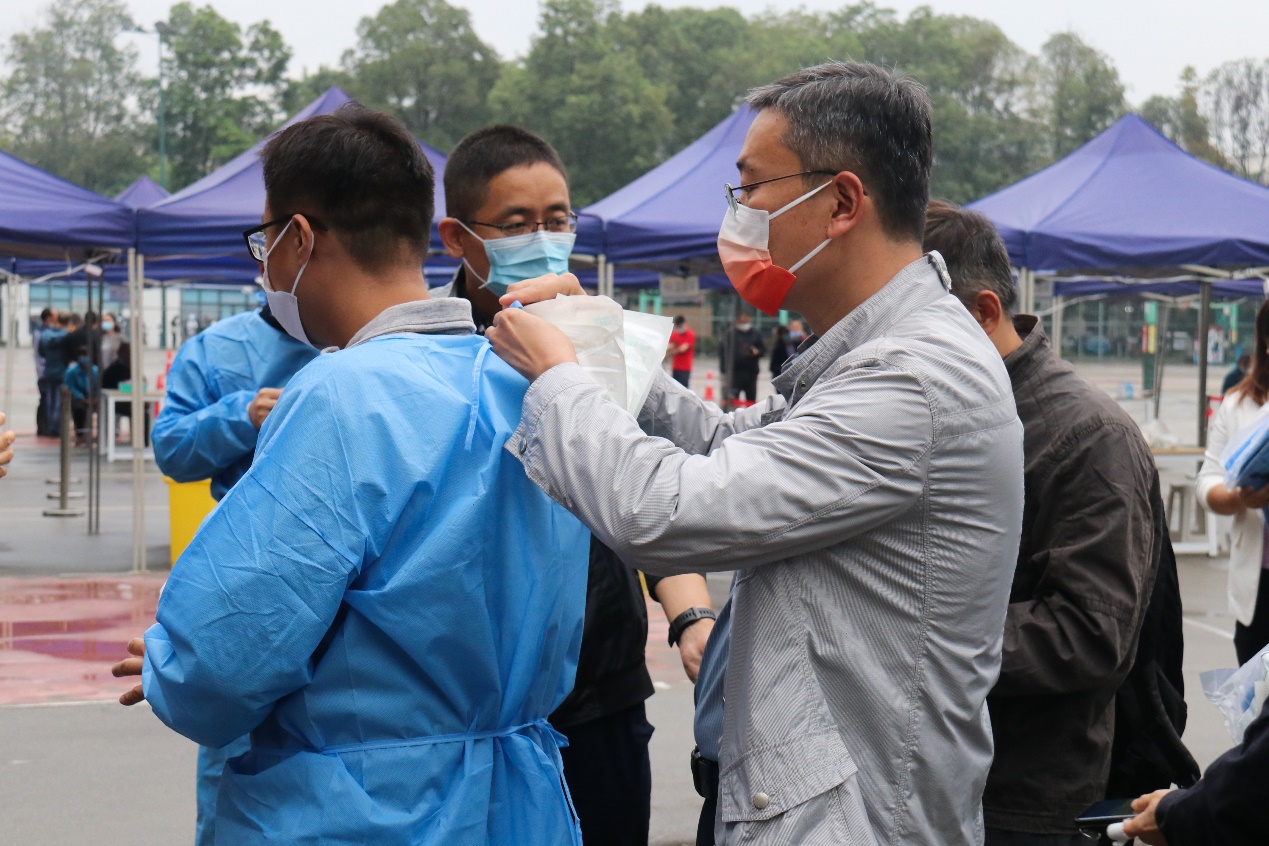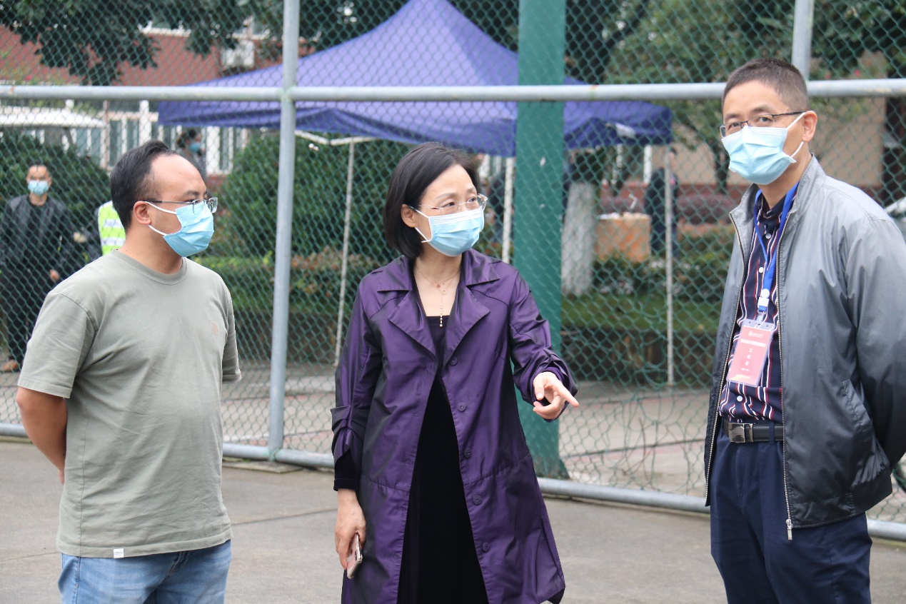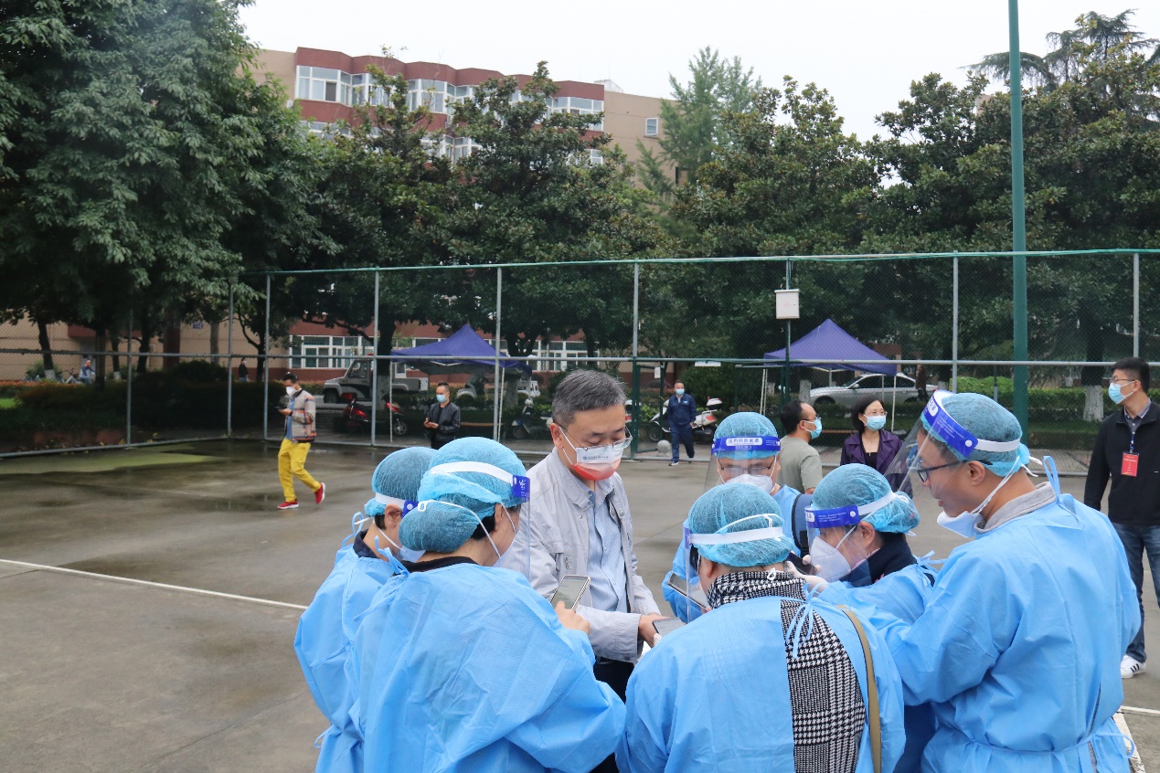 随后,校党委副书记杨爱华来到九里校区核酸检测现场指导工作,向志愿者们表示赞扬,给予他们鼓励,同时代表学校感谢志愿者们的辛勤付出,无私奉献。