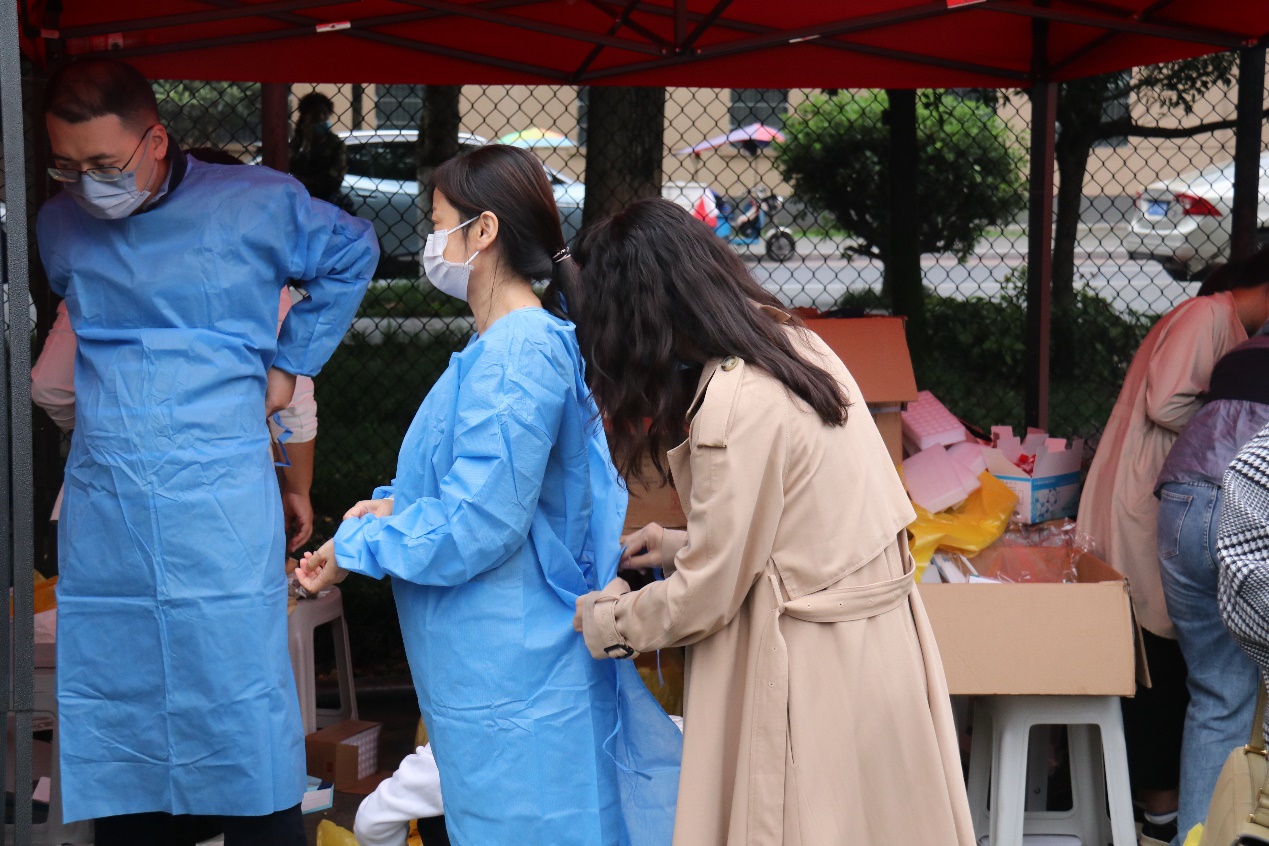 老师们到达现场后,有序地领取防护物资,互相帮助完成防护服的穿戴,统一学习了操作流程。身在三尺讲台时,授业解惑;勇往抗“疫”一线时,脚步铿锵。志愿者老师们以实际行动做出了表率。“这种需要我们出力的时候,不用犹豫,一定要站出来,主动加入到防疫工作中去。”王哿这样说到。姚霁芸和陈丹也表示,作为一名党员,就应当以身作则,站在抗“疫”一线。