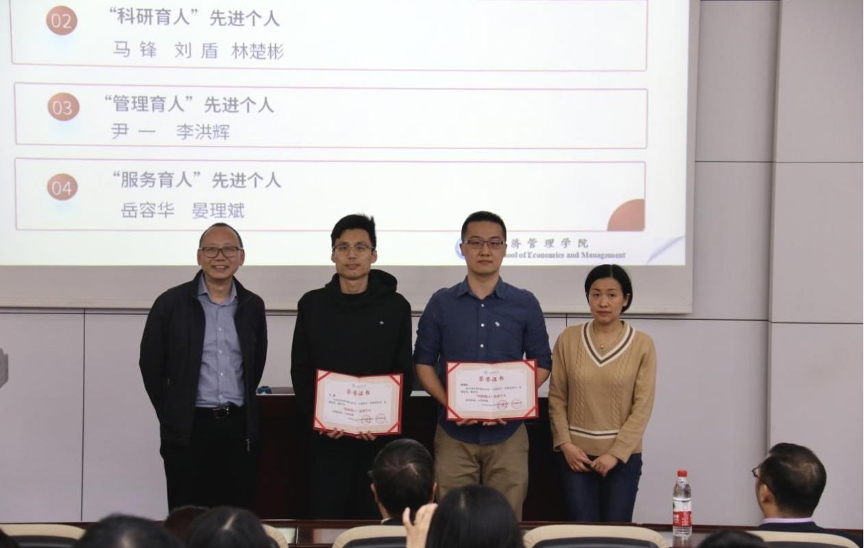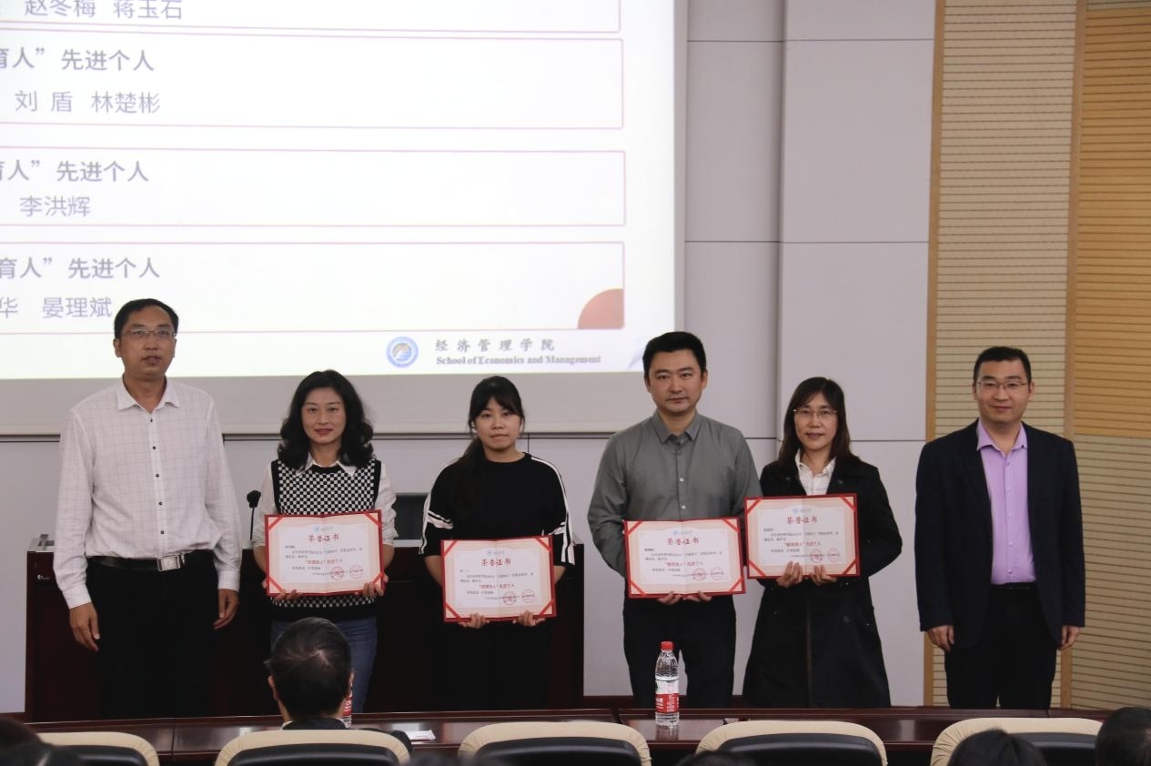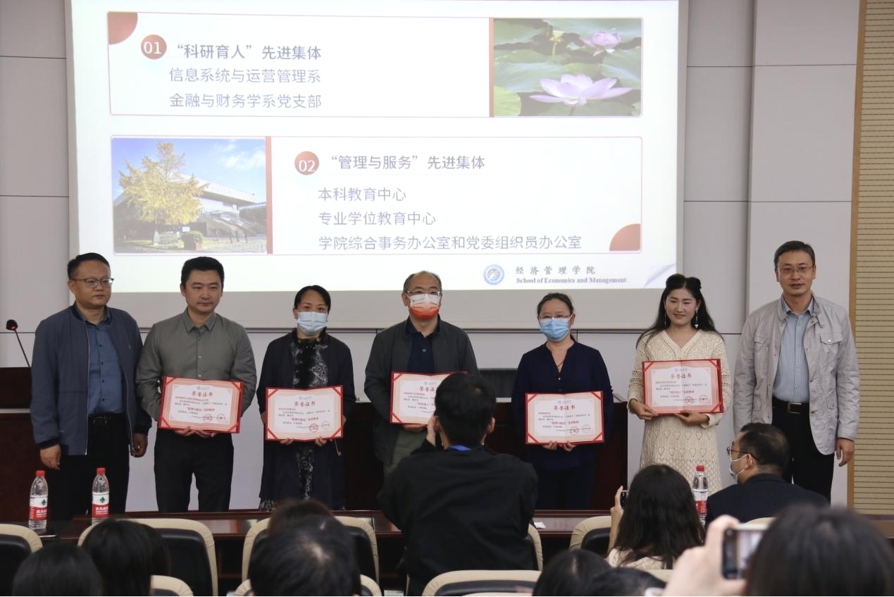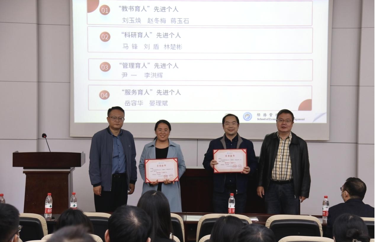 第一阶段,经济管理学院首届“立德树人”先进集体和先进个人表彰。为进一步推进和加强学院教师思想政治工作和师德师风建设,落实立德树人根本任务,通过评选忠诚党的教育事业、爱岗敬业、潜心育人的一线教职工典范,促进教职工人人尽展其才、“四有”好老师不断涌现的良好局面,经学院党委会、党政联席会研究制定了《经济管理学院“立德树人”先进集体和先进个人评奖办法》,决定每2年开展一次“立德树人”先进集体和先进个人评选表彰。2022年,经集体或个人申报、学院审核、申报集体和个人答辩、专家小组评审和学院党委会议、党政联席会议审定,共评选出“科研育人”先进集体2个、“管理与服务”先进集体3个、“教书育人”先进个人3名、“科研育人”先进个人3名、“管理育人”先进个人2名、“服务育人”先进个人2名。王斌宣布了表彰名单,学院党政领导班子成员分别为获得表彰的先进集体和先进个人颁发了证书。王斌在主持会议中指出,希望获得表彰的集体和个人再接再厉,做出更多更大更好的成果,希望全院教职工以获得表彰的先进集体和先进个人为榜样,你追我赶,不断进取,积极投身教育事业,进一步增强使命感、责任感,齐心协力促进学院各项工作再上新台阶。