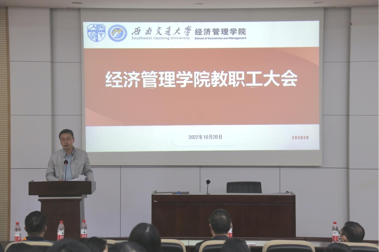 2022年10月20日下午,经济管理学院在九里校区0215会议室召开全院教职工大会。学院党政领导班子全体成员、全体教职工参加会议。会议由学院党委书记王斌主持,分为三个阶段进行。