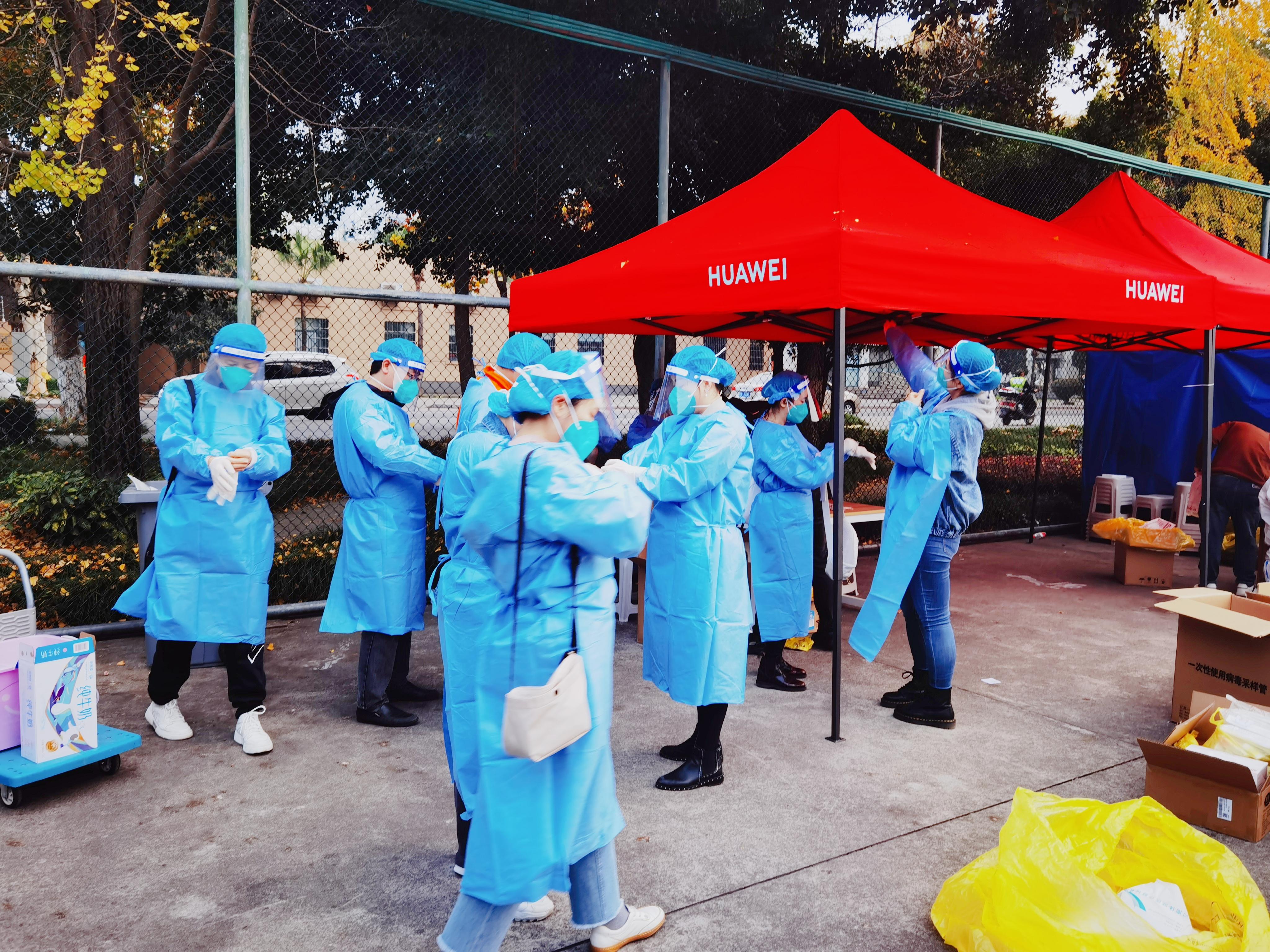经济管理学院通过教职工个人报名、学院党委推荐,组织了13名教职工再次担任11月24日九里校区校内核酸检测工作志愿者,协助核酸采样工作。到场参与核酸检测志愿服务工作的老师有:何鹏、罗伟民、崔长江、何建晖、尹一、漆敏、练婧曦、姚霁芸、张媛媛、王熙、向洪信、滕倩、宋洁。24日清晨7点30分,天刚蒙蒙亮,志愿者们准时到达九里校区篮球场核酸检测点,有序地领取防护物资,互相帮助完成防护服的穿戴,认真听工作人员讲解,统一学习操作流程,做好各项准备工作。