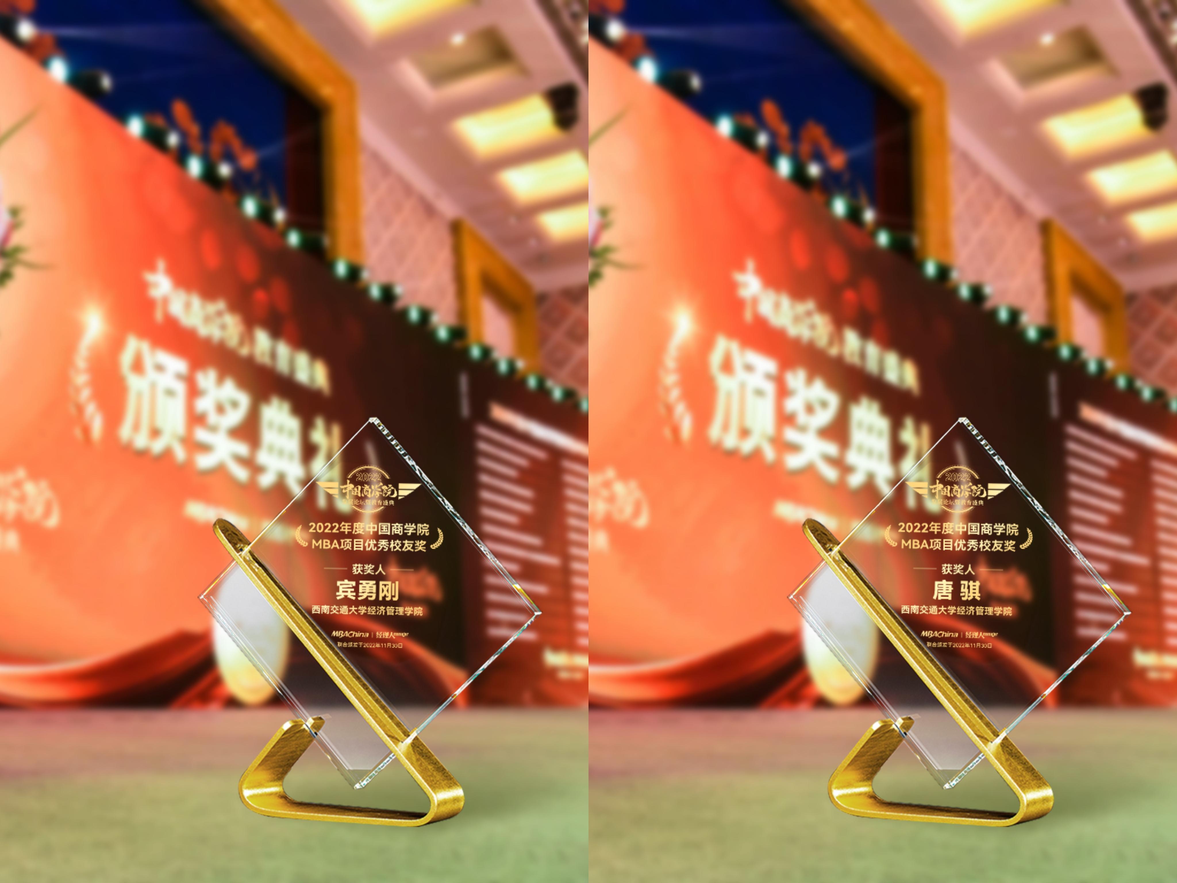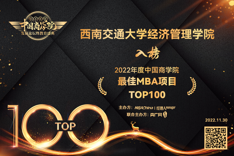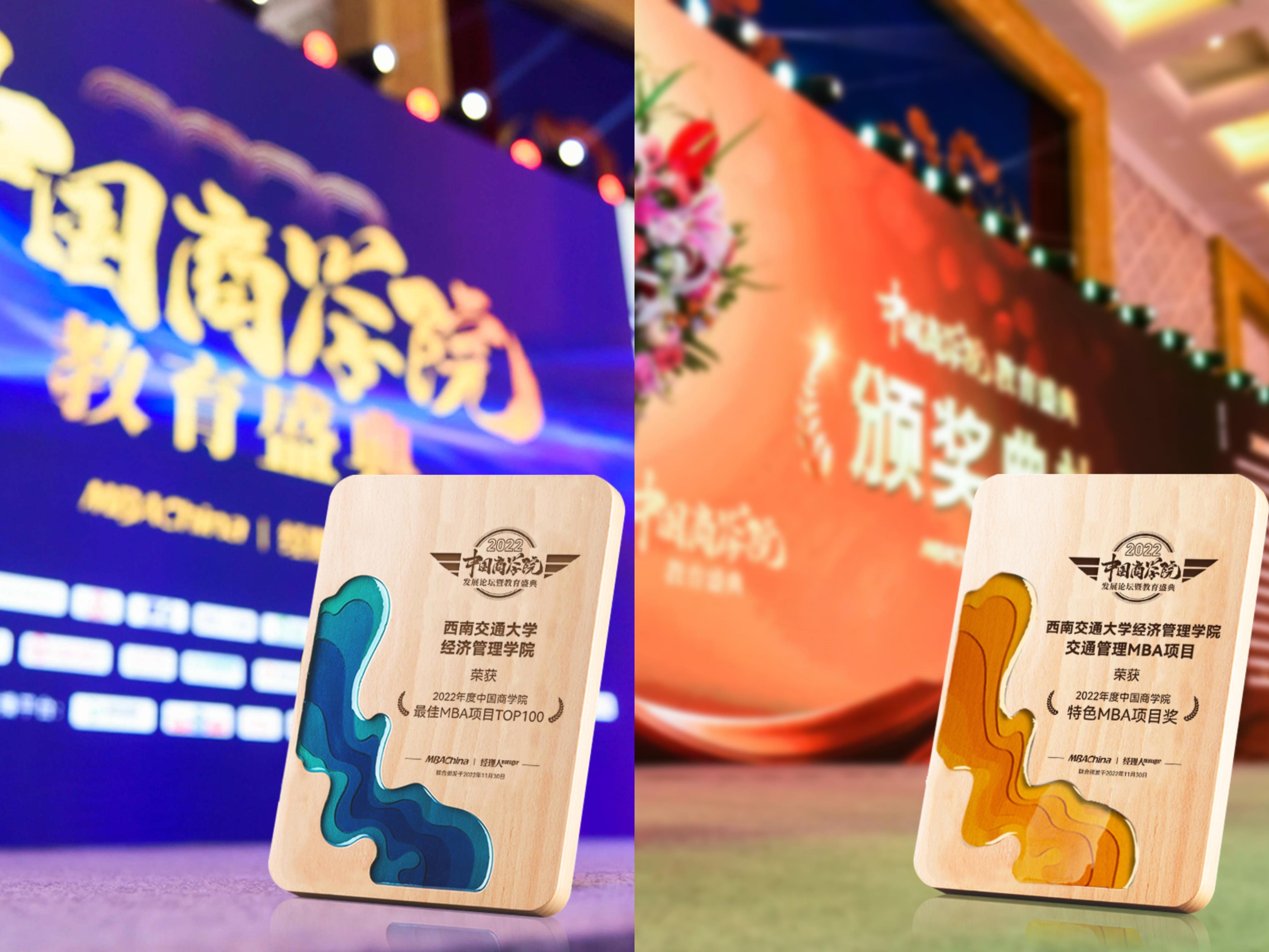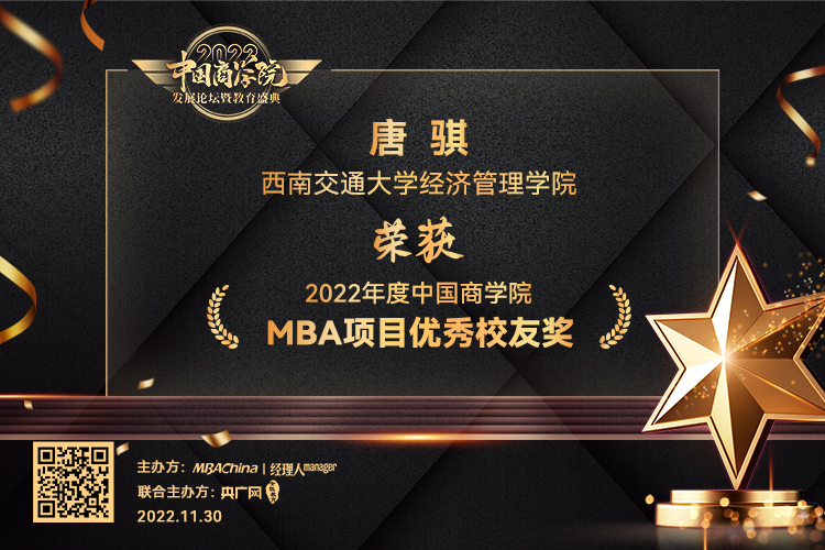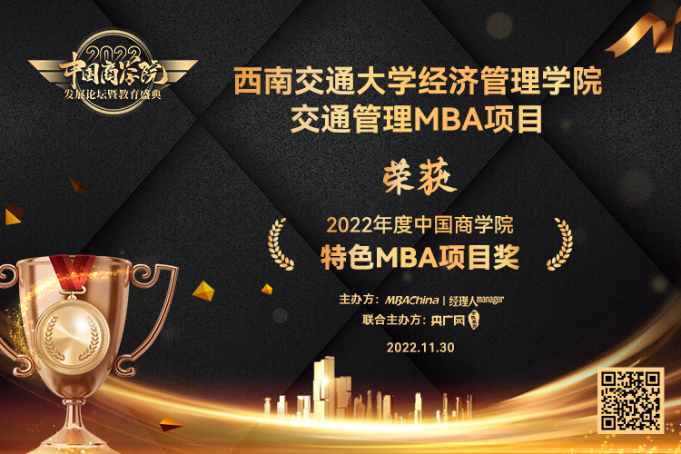 西南交通大学经济管理学院MBA项目凭借优异的教学成果、独特的培养模式,经过多环节、多维度的层层评选,一举荣获多个荣誉奖项:西南交通大学经济管理学院MBA项目成功入榜“2022年度中国商学院最佳MBA项目TOP100”;西南交通大学经济管理学院交通管理MBA项目荣获“2022年度中国商学院特色MBA项目奖”;宾勇刚、唐骐两位校友荣获“2022年度中国商学院MBA项目优秀校友奖”。