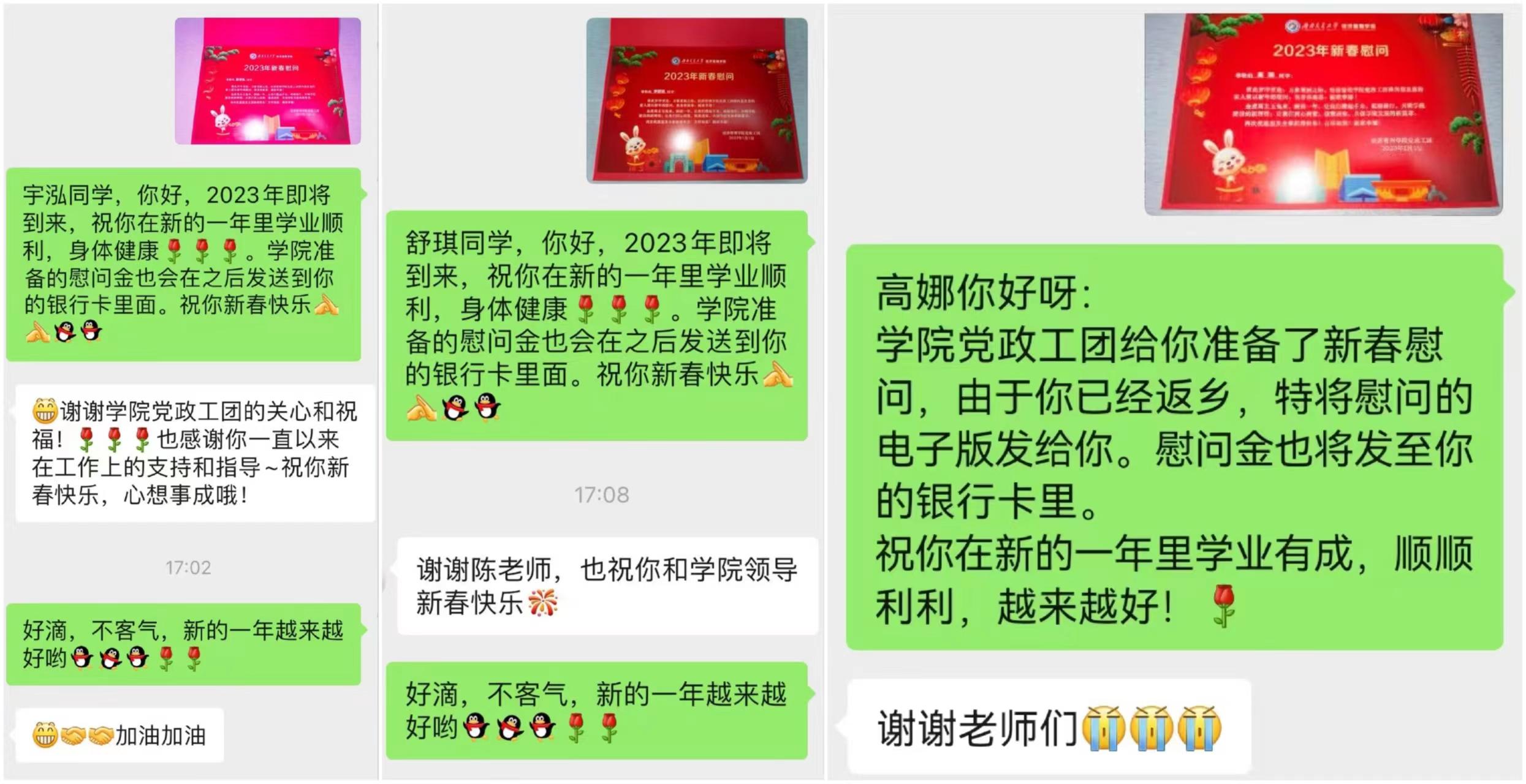 学院党委副书记杨宏毅和辅导员老师们利用电话或微信的形式代表学院党委慰问了博士第二党支部彭宇泓同学、硕士2021级第四党支部李舒琪同学、硕士2022级第四党支部高娜等同学,鼓励同学们在新的一年学业顺利、身体健康,新春快乐!