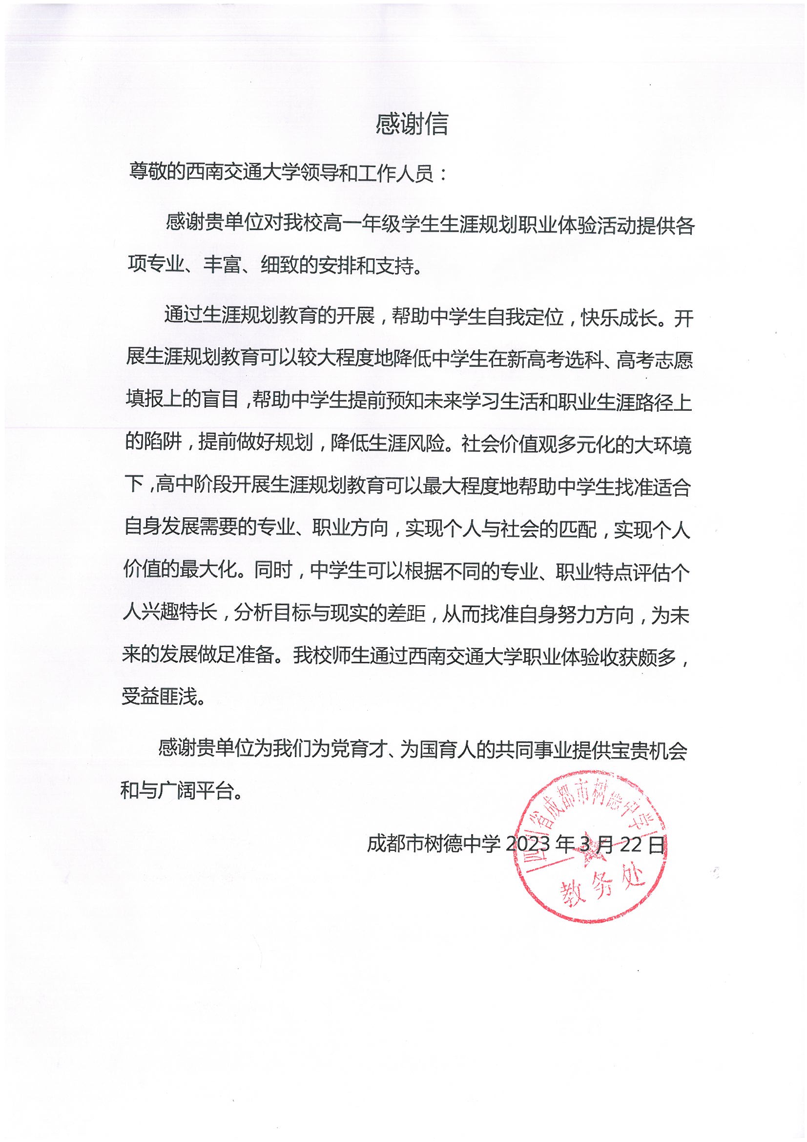 上午,我院师生代表与大使团团员在校园南门热烈地迎接了树德中学的同学们。接着,大使团团员带领同学们参观了我校九里校区。参观活动持续约两个小时,树德中学的同学们深入了解了“竢实扬华,自强不息”的交大精神。