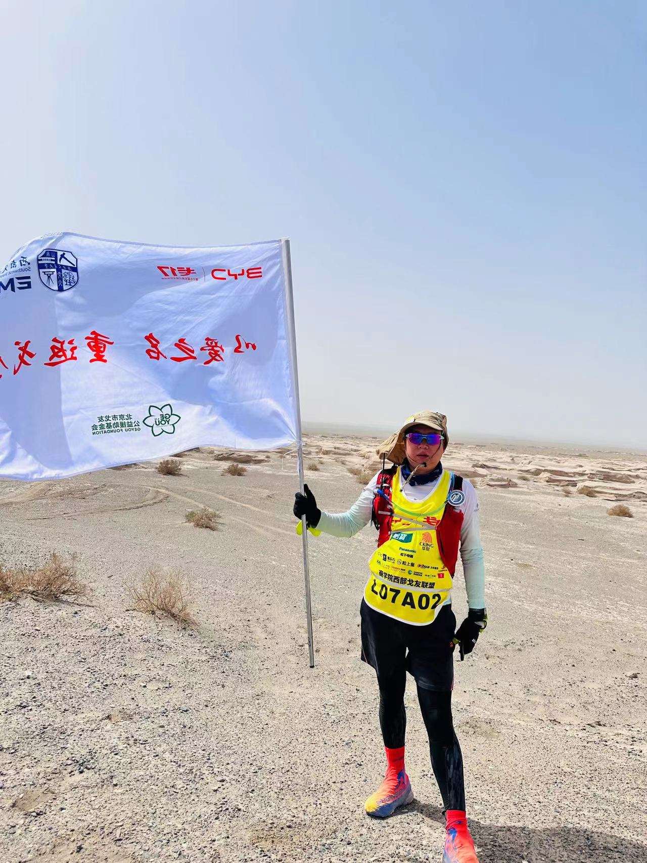 戈赛A+组是玄奘之路戈壁挑战赛最难的组别,选手需在22小时内跑完其他选手在四天三夜内完成的121公里路程,全程需要自补给、自导航,日夜兼程。今年的戈赛,天气异常突变和恶劣,昼夜温差大,风沙肆虐到一度熔断A+的赛程,完赛率只有36%。拓守盛校友以超人的意志力只用了16小时完成比赛。他身披学院旗帜冲过终点时,全场响彻起最激动人心的欢呼声,“西南交通大学”这几个字也第一次打在戈壁挑战赛舞台的冠军榜上!