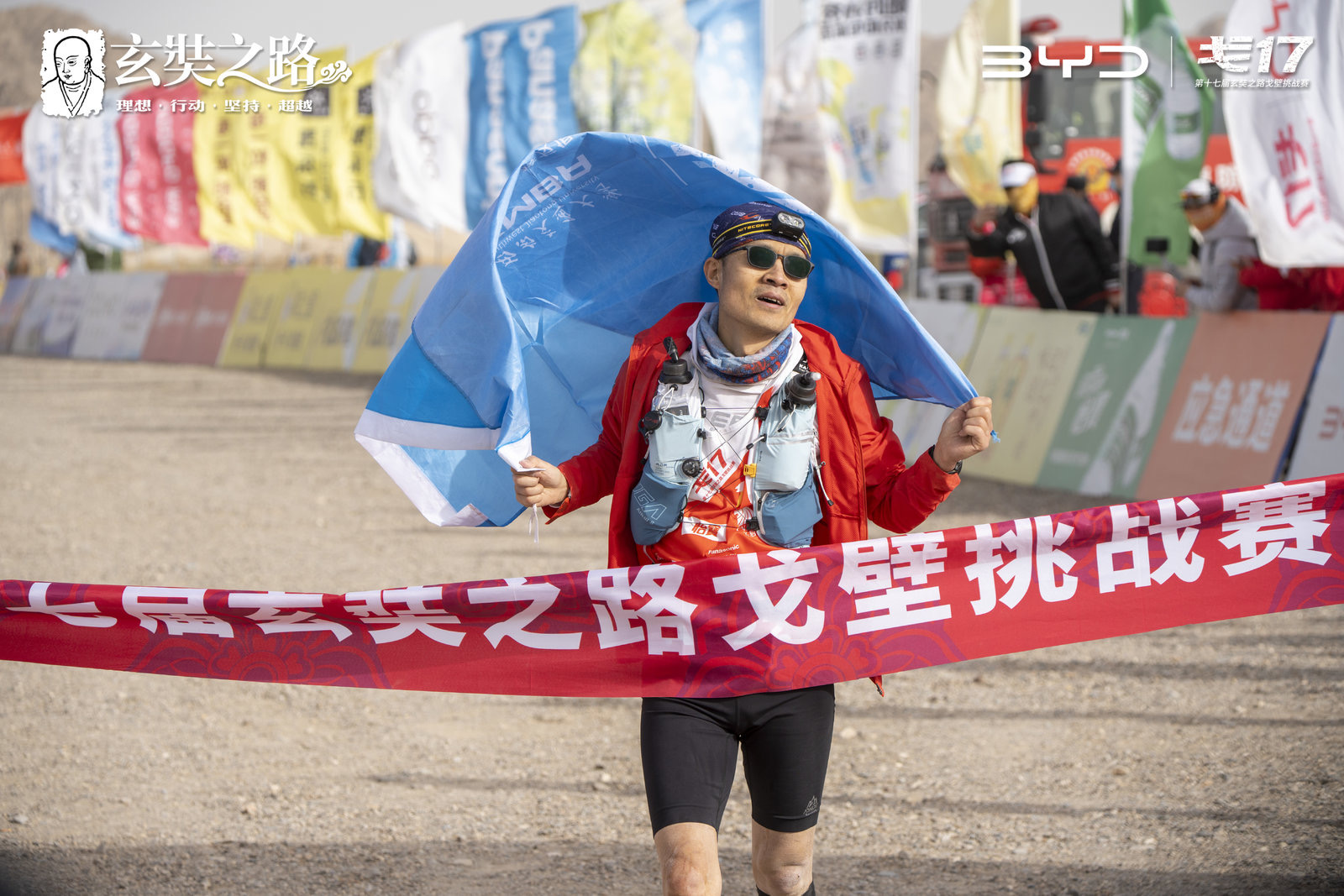 “孤峰绝顶万余嶒,策仗攀萝渐渐登。”在玄奘法师的笔下,玄奘之路,孤绝相伴,日月同尘,寡悬天际。玄奘之路的比赛却又是温暖与团结的不断重逢。全程比赛没有对手只有戈友,在超过前方戈友时,他会给你一句“加油”;迎风跑不动时,也会有温暖的手掌在后面助推;“茫茫戈壁,走过都是兄弟姐妹”感动了每一位戈友。而幕后英雄们更让人动容,教练、队医和后勤保障的队友们一直都会站在终点,高举队旗,犹如灯塔般的身影,让队员看到回家的港湾。
