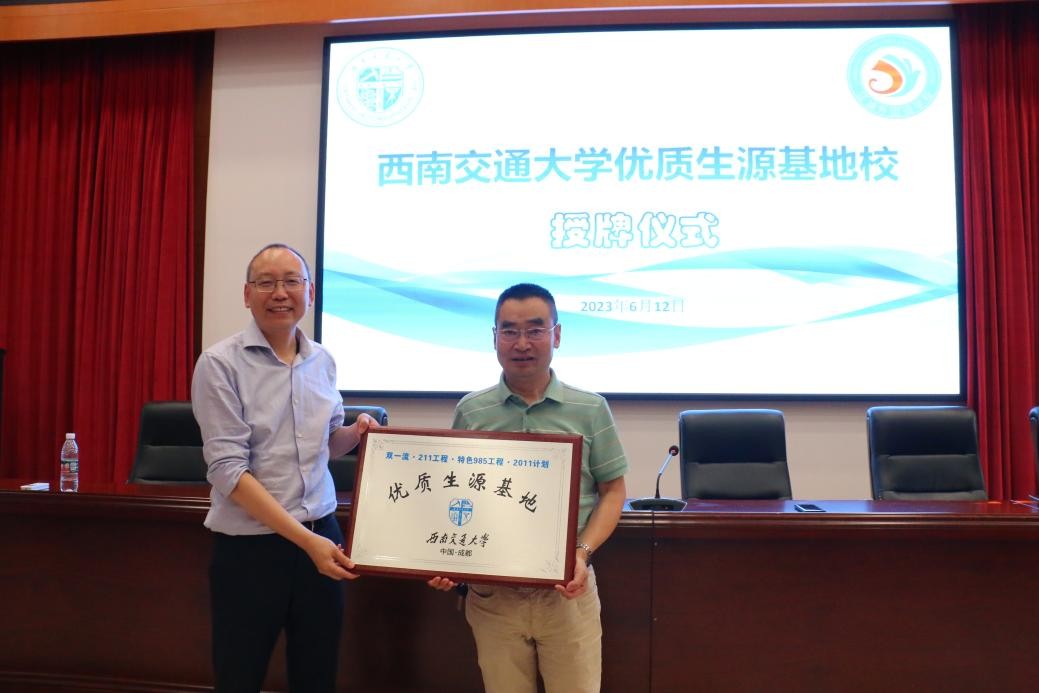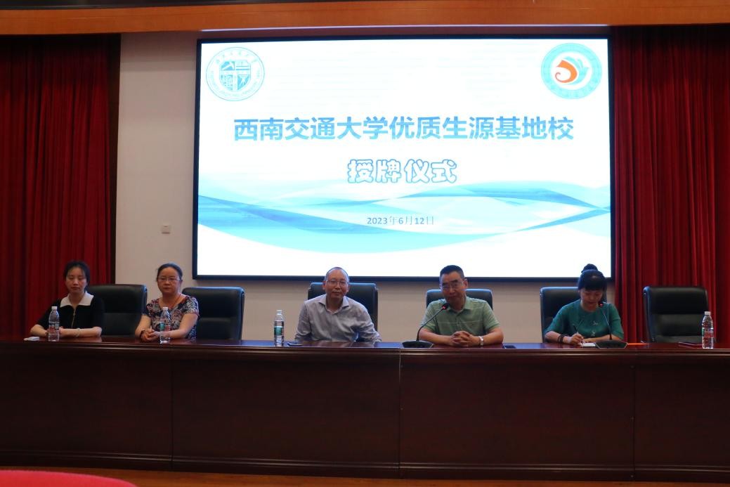 为进一步做好我校招生宣传工作,提升生源质量,强化与各生源地中学之间的沟通与交流,携手共育优质生源, 6月12日下午,西南交通大学与江油外国语学校“优质生源基地”校授牌仪式在江油外国语学校高中部会议厅举行。西南交通大学经济管理学院教授、副院长李良,副教授、本科教育中心主任赖晓东,本科教育中心教务员漆敏出席活动,江油外国语学校党委书记、校长勾红蔚,高中部副校长李淑梅及部分高中师生出席活动。仪式由高中部副校长李淑梅主持。