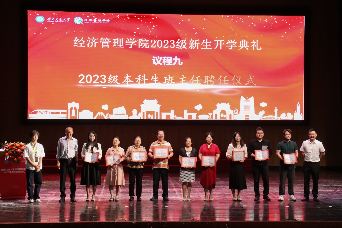 9月3日下午,西南交通大学经济管理学院在九里校区大学生会堂隆重举行了“启航交大 逐梦未来”2023级新生开学典礼。出席本次开学典礼的领导和嘉宾有经济管理学院执行院长郭强,学院2009届电子商务专业本科毕业生、2012届管理科学与工程专业硕士毕业生、新希望集团有限公司党委委员、新希望乳业股份有限公司党委书记郑世锋,原经济管理学院党总支副书记、2021年“最美交大人”梁锦唐,学院党委副书记杨宏毅,学院党委副书记、纪委书记晏理斌,副院长周嘉南、李良、聂佳佳,以及学院各系、中心的教职工代表。本次开学典礼采取线上线下结合的方式,由杨宏毅主持。