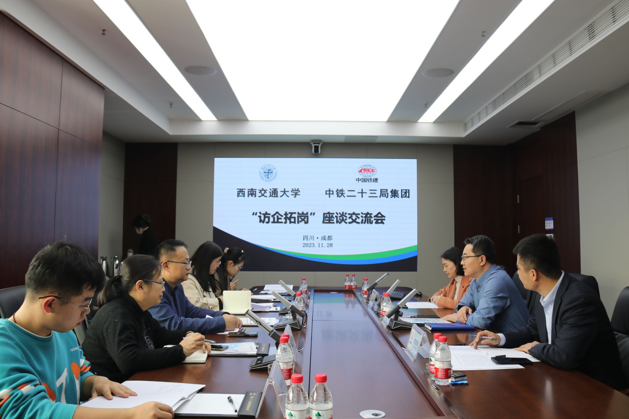 与会双方于中铁二十三局集团总部7楼会议室进行了座谈交流。中铁二十三局集团人力资源部经理、党委干部部部长刘玉柱向郭强一行表示热烈欢迎,他表示,交大是中铁二十三局的老朋友,希望这次交流能使校企合作进一步深化,而后就中铁二十三局的企业发展动态、人才需求情况、对毕业生的素质要求做详细说明。
