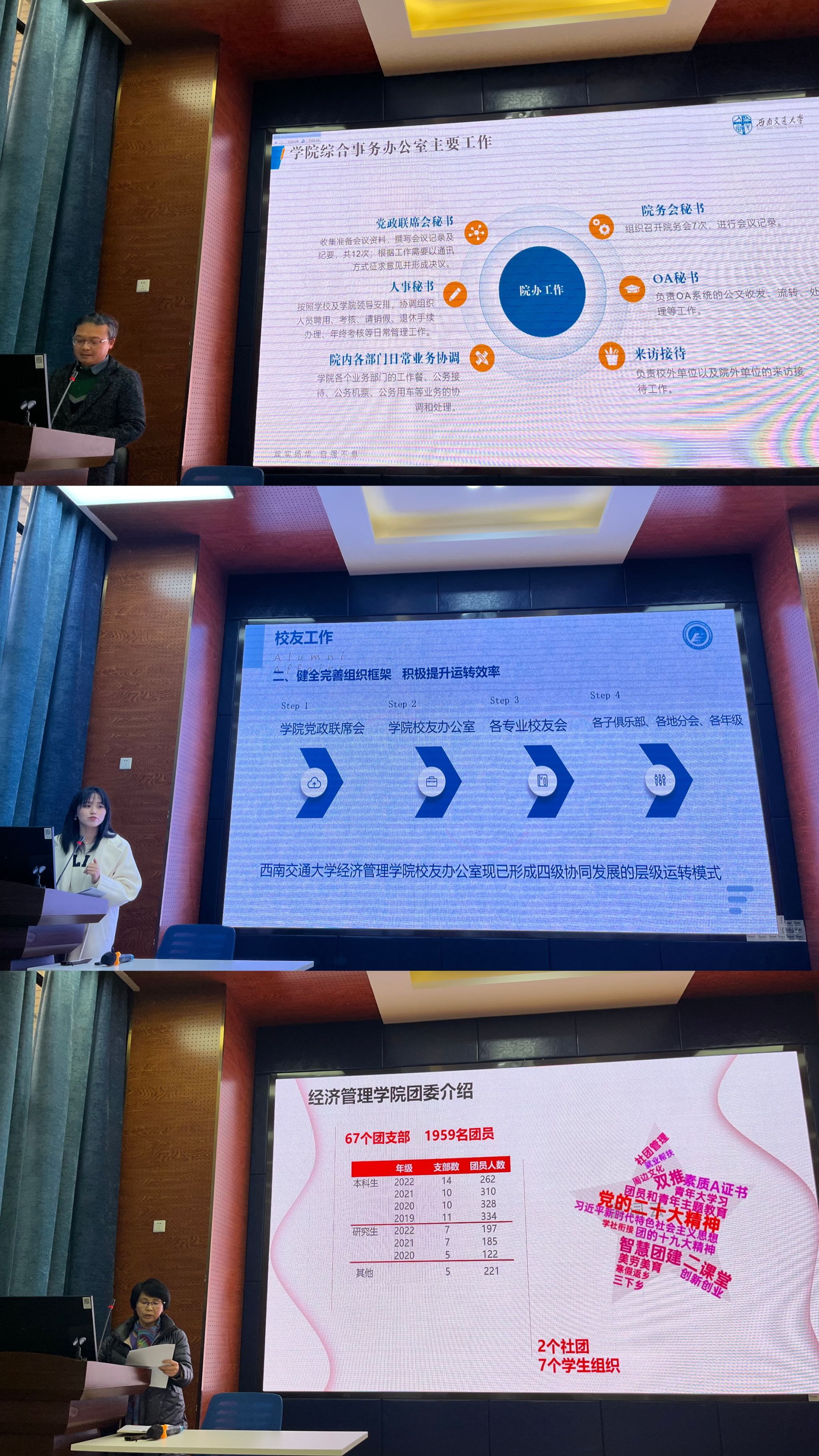 会议第二阶段,科职干部对本年度的工作进行了总结汇报。学院综合事务办公室主任、学生支持办公室主任、学工组副组长、专职组织员共6名科职干部对本年度的工作进行了总结和反思,并对新一年的工作计划和目标作出了展望。